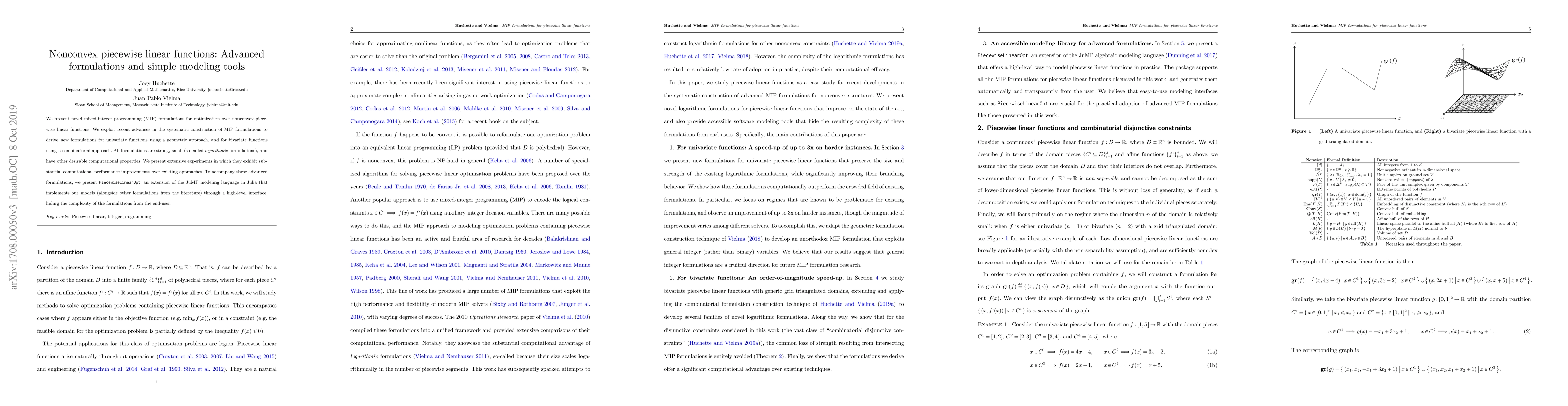 This paper introduces advanced mixed-integer programming formulations for optimizing nonconvex piecewise linear functions, demonstrating significant computational performance improvements. It also presents PiecewiseLinearOpt, a user-friendly extension of the JuMP language in Julia that simplifies the implementation of these models.