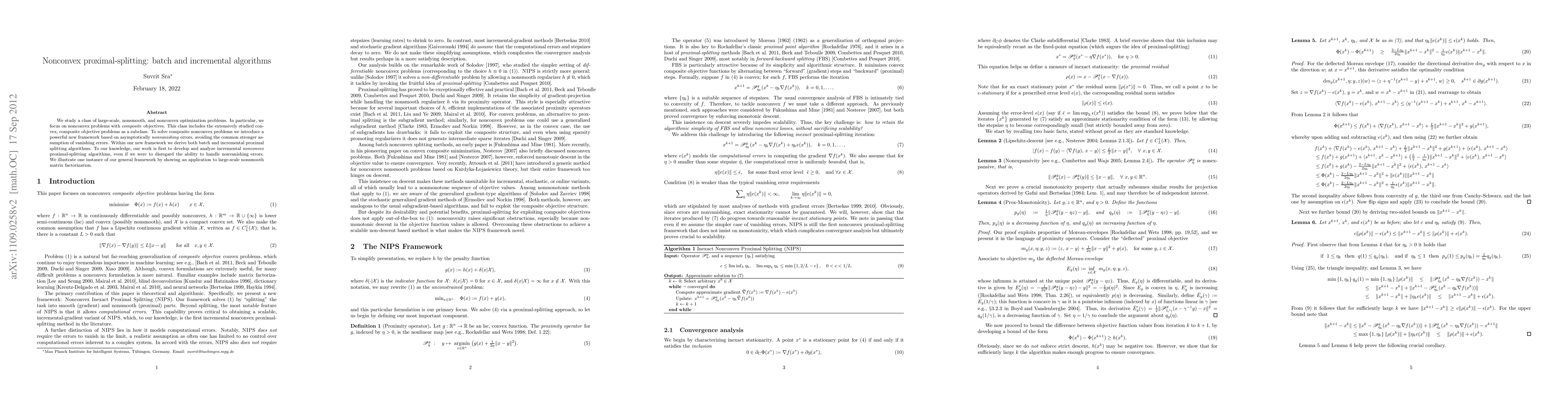 Within the unmanageably large class of nonconvex optimization, we consider the rich subclass of nonsmooth problems that have composite objectives---this already includes the extensively studied convex, composite objective problems as a special case. For this subclass, we introduce a powerful, new framework that permits asymptotically non-vanishing perturbations. In particular, we develop perturbation-based batch and incremental (online like) nonconvex proximal splitting algorithms. To our knowledge, this is the first time that such perturbation-based nonconvex splitting algorithms are being proposed and analyzed. While the main contribution of the paper is the theoretical framework, we complement our results by presenting some empirical results on matrix factorization.