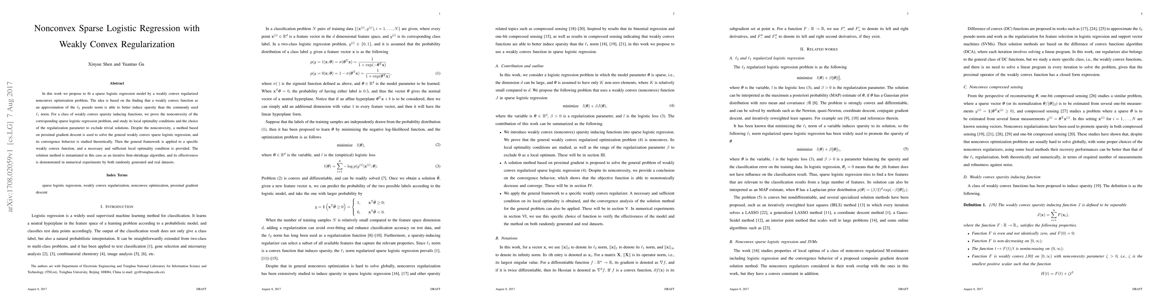 This paper proposes a weakly convex regularized nonconvex optimization approach for sparse logistic regression, demonstrating that weakly convex functions can better induce sparsity than the $\ell_1$ norm. It studies the local optimality conditions and regularization parameter choice, and uses proximal gradient descent to solve the problem, showing its effectiveness through numerical experiments.