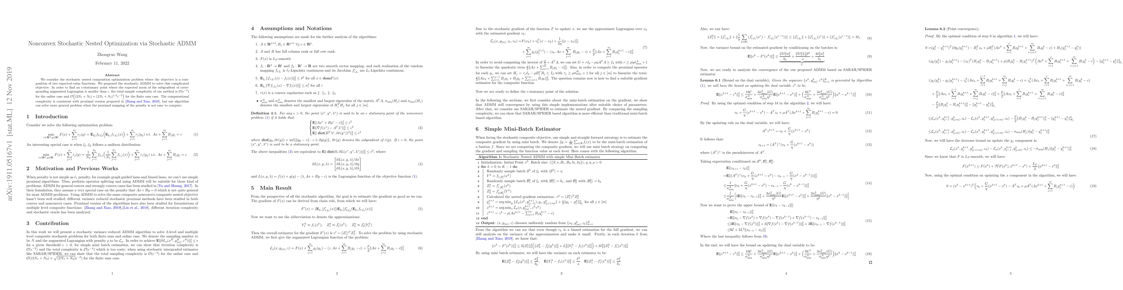 A new optimization algorithm called stochastic ADMM is proposed to solve a complex problem where an objective function is composed of two expected-value functions. The algorithm has a lower computational complexity than existing methods for solving similar problems.