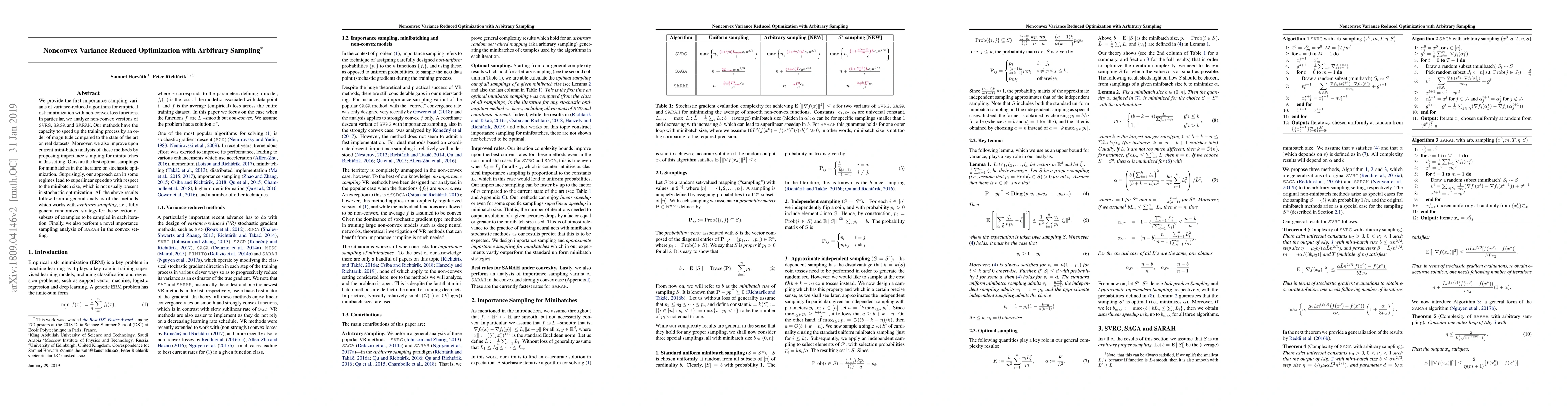 We provide the first importance sampling variants of variance reduced algorithms for empirical risk minimization with non-convex loss functions. In particular, we analyze non-convex versions of SVRG, SAGA and SARAH. Our methods have the capacity to speed up the training process by an order of magnitude compared to the state of the art on real datasets. Moreover, we also improve upon current mini-batch analysis of these methods by proposing importance sampling for minibatches in this setting. Surprisingly, our approach can in some regimes lead to superlinear speedup with respect to the minibatch size, which is not usually present in stochastic optimization. All the above results follow from a general analysis of the methods which works with arbitrary sampling, i.e., fully general randomized strategy for the selection of subsets of examples to be sampled in each iteration. Finally, we also perform a novel importance sampling analysis of SARAH in the convex setting.