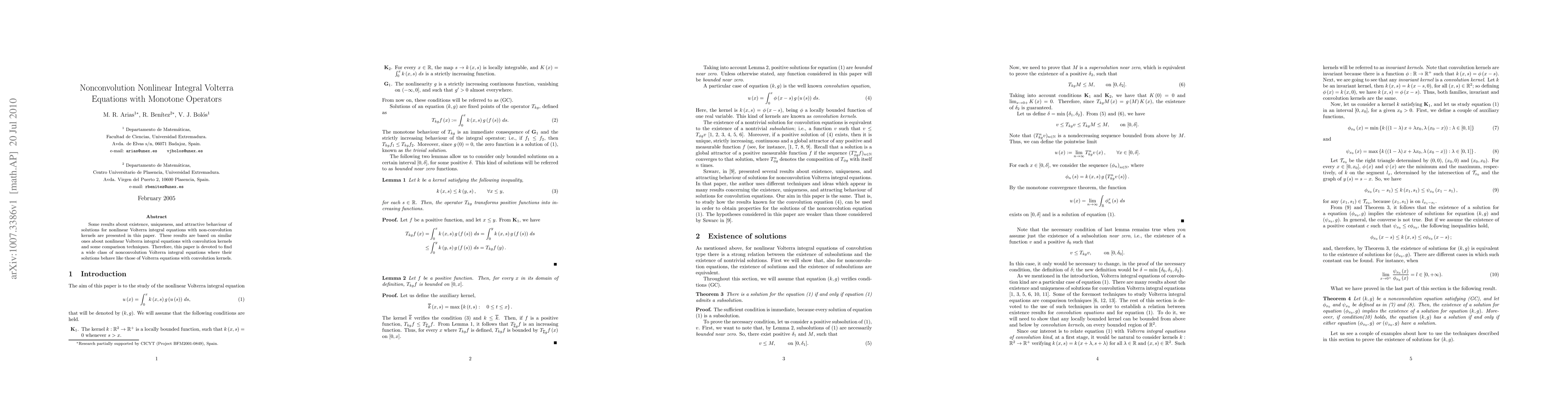 This paper investigates the existence, uniqueness, and attractive behavior of solutions for nonlinear Volterra integral equations with non-convolution kernels, extending results from convolution kernel equations using comparison techniques. It aims to identify a broad class of nonconvolution Volterra equations whose solutions exhibit similar behaviors to those with convolution kernels.