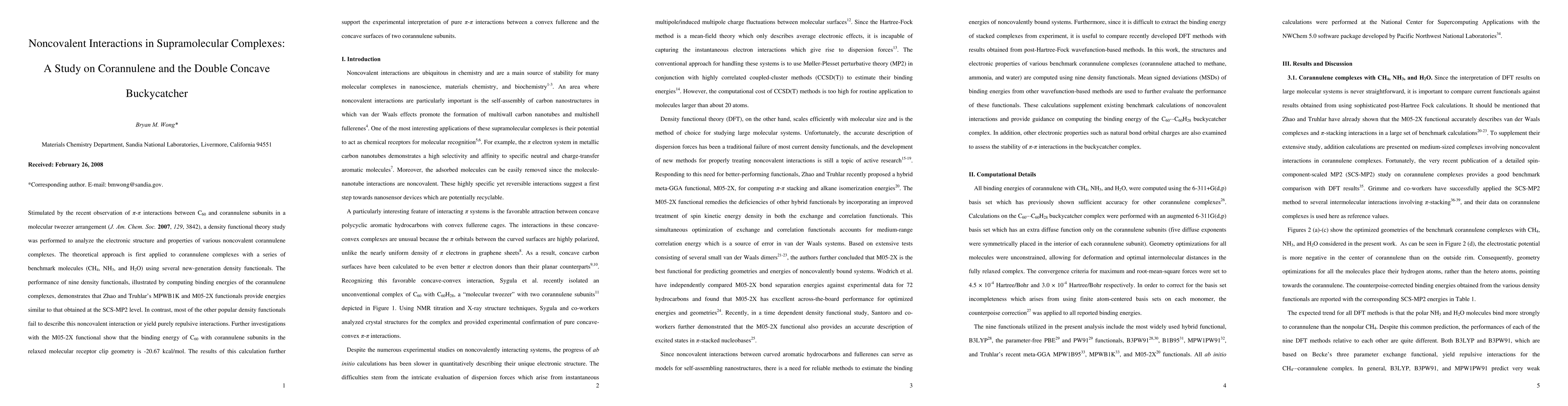 This study employs density functional theory to analyze noncovalent interactions in supramolecular complexes, specifically focusing on corannulene and the double concave buckycatcher. The research finds that Zhao and Truhlar's MPWB1K and M05-2X functionals accurately describe π-π interactions, while other popular functionals either fail or yield repulsive interactions.
