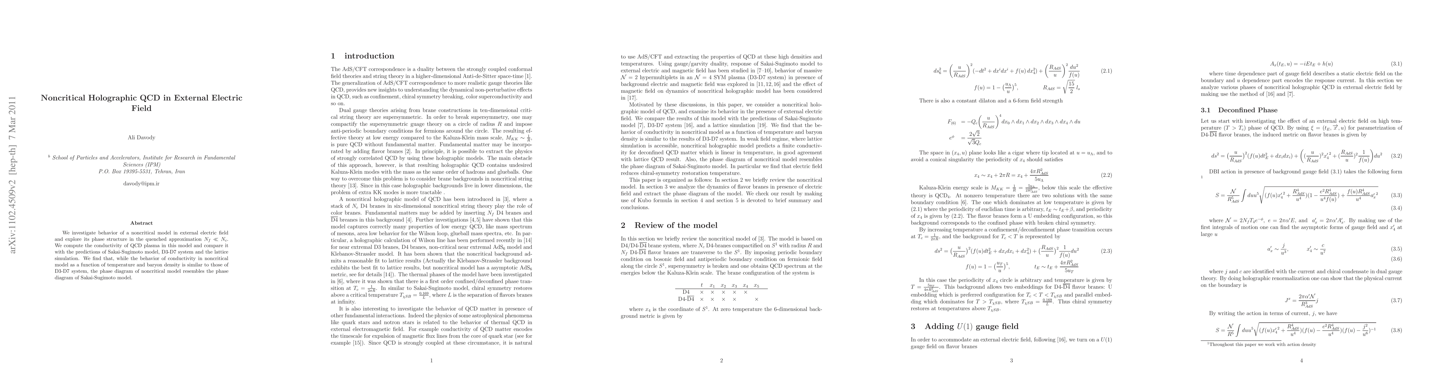 We investigate behavior of a noncritical model in external electric field and explore its phase structure in the quenched approximation N_f>> N_c. We compute the conductivity of QCD plasma in this model and compare it with the predictions of Sakai-Sugimoto model, D3-D7 system and the lattice simulation. We find that, while the behavior of conductivity in noncritical model as a function of temperature and baryon density is similar to those of D3-D7 system, the phase diagram of noncritical model resembles the phase diagram of Sakai-Sugimoto model.