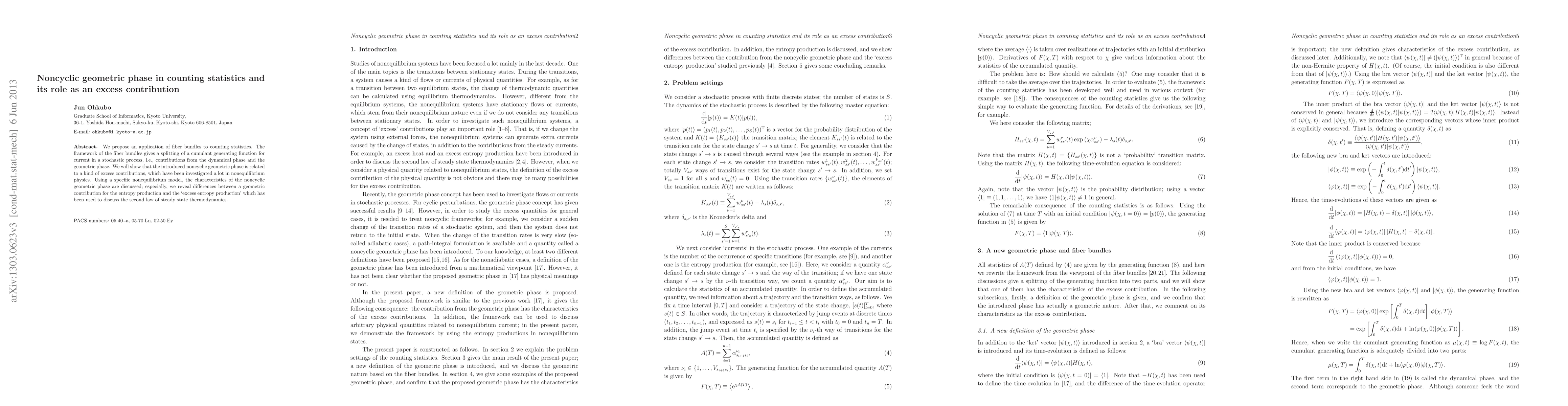 We propose an application of fiber bundles to counting statistics. The framework of the fiber bundles gives a splitting of a cumulant generating function for current in a stochastic process, i.e., contributions from the dynamical phase and the geometric phase. We will show that the introduced noncyclic geometric phase is related to a kind of excess contributions, which have been investigated a lot in nonequilibrium physics. Using a specific nonequilibrium model, the characteristics of the noncyclic geometric phase are discussed; especially, we reveal differences between a geometric contribution for the entropy production and the `excess entropy production' which has been used to discuss the second law of steady state thermodynamics.