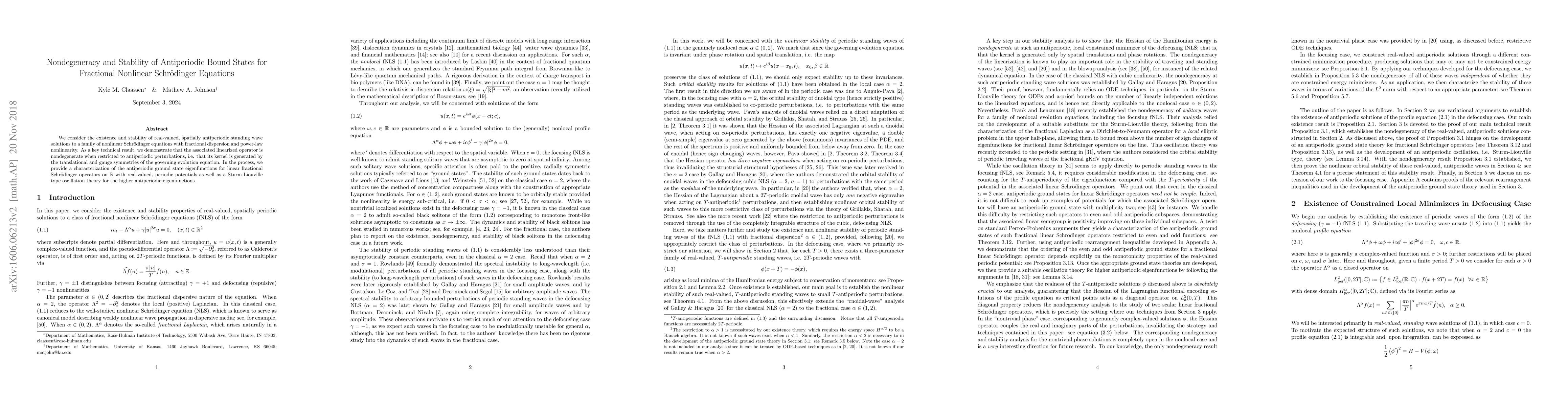 This paper investigates the existence and stability of specific solutions to nonlinear Schr"odinger equations with fractional dispersion and power-law nonlinearity. It demonstrates that certain antiperiodic standing wave solutions are stable under perturbations.
