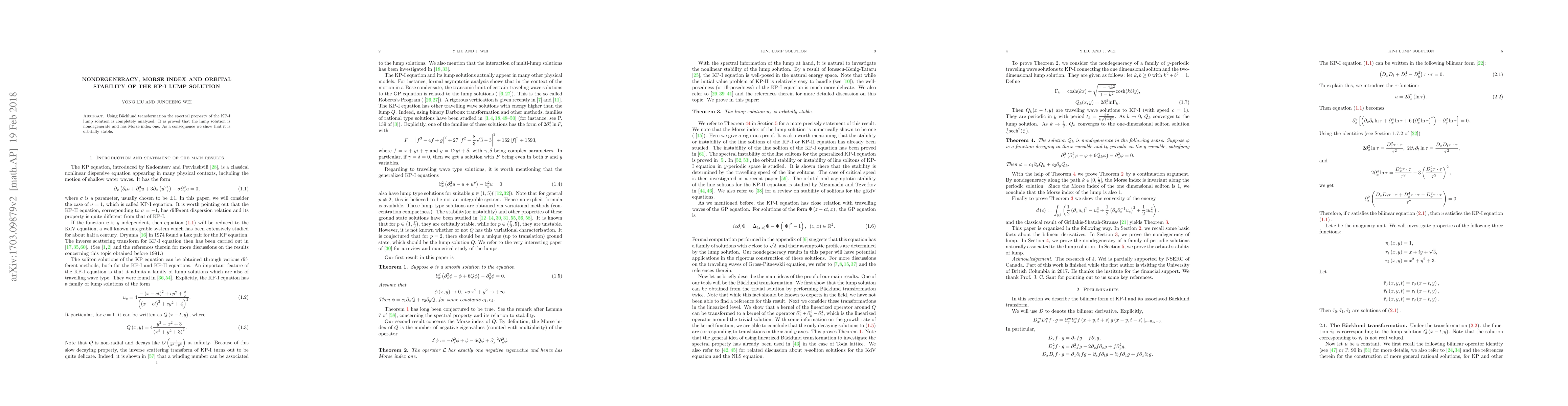This paper demonstrates that the lump solution $Q(x,y)$ of the KP-I equation is nondegenerate and orbitally stable. It proves that only linear combinations of $\partial_x Q$ and $\partial_y Q$ decay for solutions to the linearized operator, and it establishes a Morse index of exactly one.