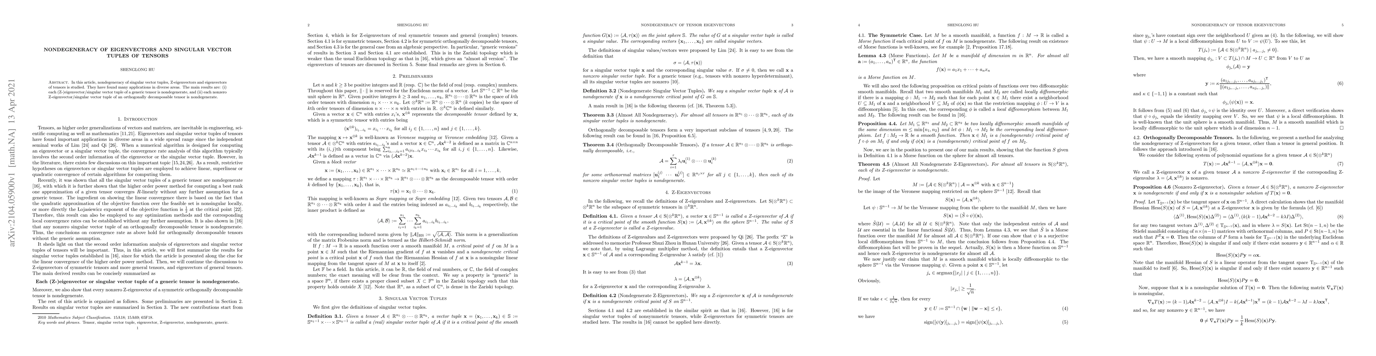 This paper investigates the nondegeneracy of singular vector tuples, Z-eigenvectors, and eigenvectors of tensors, proving that generic tensors have nondegenerate (Z-)eigenvector/singular vector tuples. Additionally, it shows that nonzero (Z-)eigenvector/singular vector tuples of orthogonally decomposable tensors are also nondegenerate.
