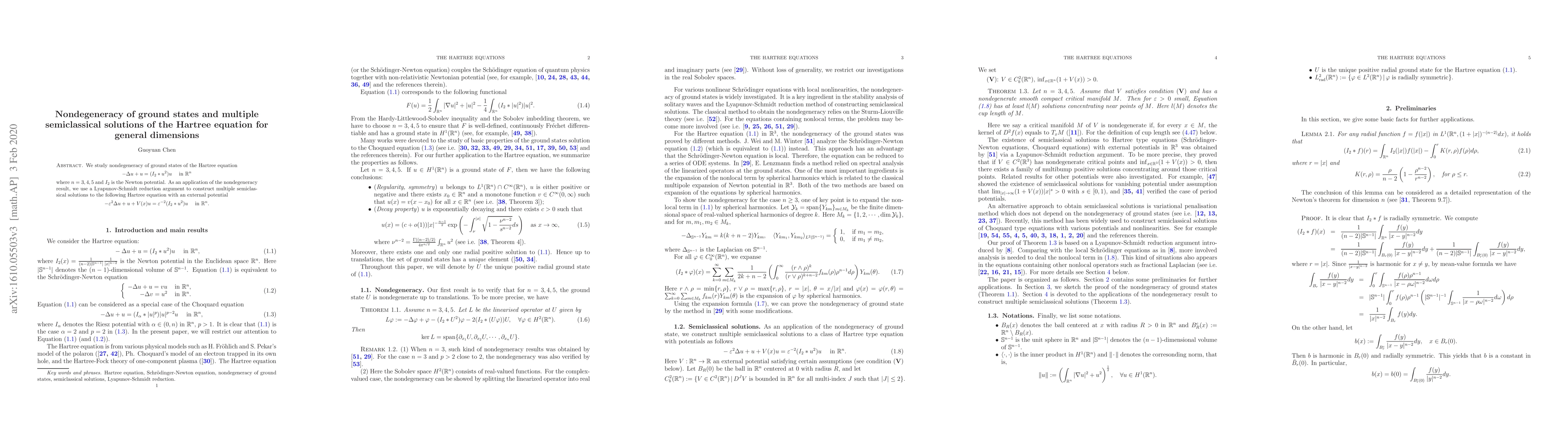 We study nondegeneracy of ground states of the Hartree equation $$ -\Delta u+u=(I_{2}\ast u^2)u\quad\mbox{ in }\mathbb R^n $$ where $n=3,4,5$ and $I_2$ is the Newton potential. As an application of the nondegeneracy result, we use a Lyapunov-Schmidt reduction argument to construct multiple semiclassical solutions to the following Hartree equation with an external potential $$-\varepsilon^2\Delta u+u+V(x)u=\varepsilon^{-2}(I_{2}\ast u^2)u\quad \mbox{ in }\mathbb R^n.$$