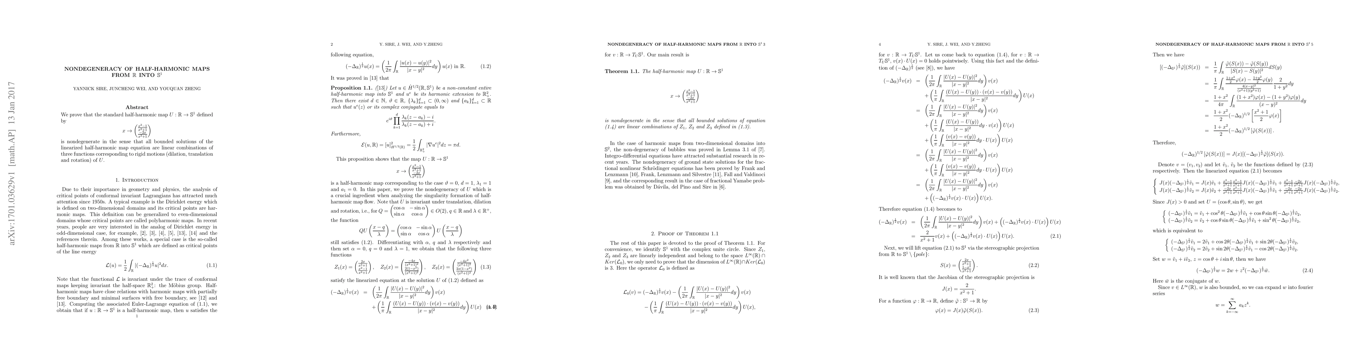 We prove that the standard half-harmonic map $U:\mathbb{R}\to\mathbb{S}^1$ defined by \begin{equation*} x\to \begin{pmatrix} \frac{x^2-1}{x^2+1} \frac{-2x}{x^2+1} \end{pmatrix} \end{equation*} is nondegenerate in the sense that all bounded solutions of the linearized half-harmonic map equation are linear combinations of three functions corresponding to rigid motions (dilation, translation and rotation) of $U$.