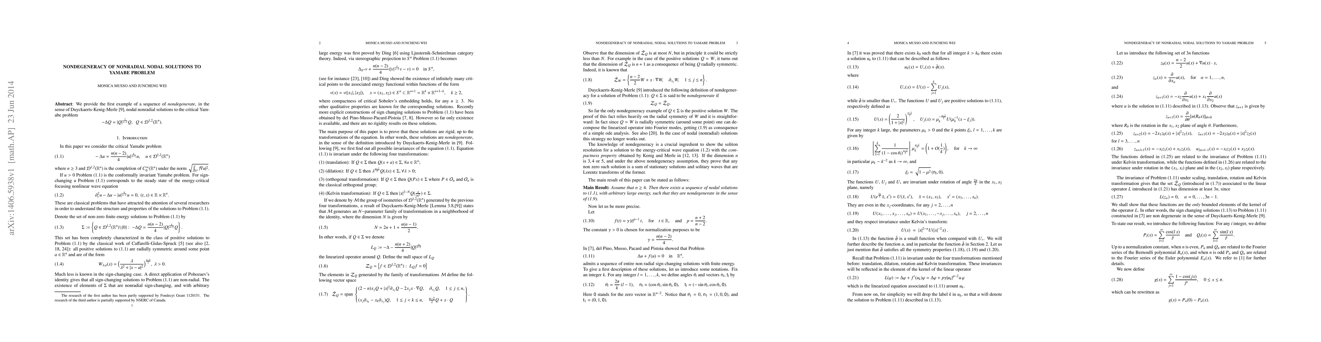 We provide the first example of a sequence of {\em nondegenerate}, in the sense of Duyckaerts-Kenig-Merle \cite{DKM}, nodal nonradial solutions to the critical Yamabe problem $$ -\Delta Q= |Q|^{\frac{2}{n-2}} Q, \ \ Q \in {\mathcal D}^{1,2} (\R^n). $$