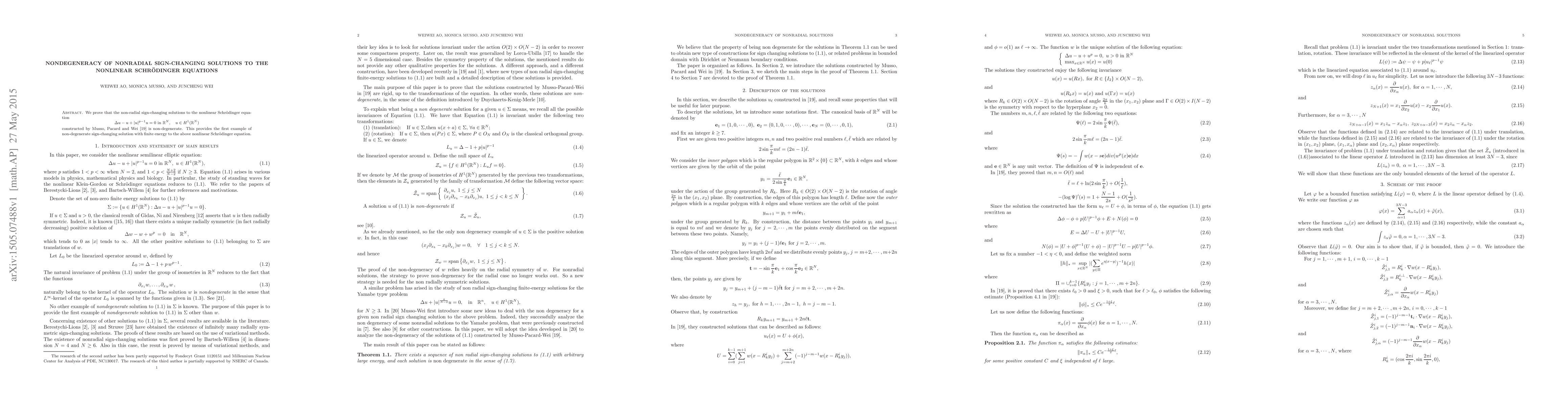 Summary: This paper proves the nondegeneracy of non-radial sign-changing solutions to a specific nonlinear Schrödinger equation, providing the first example of such finite-energy solutions. The solutions were previously constructed by Musso, Pacard, and Wei.