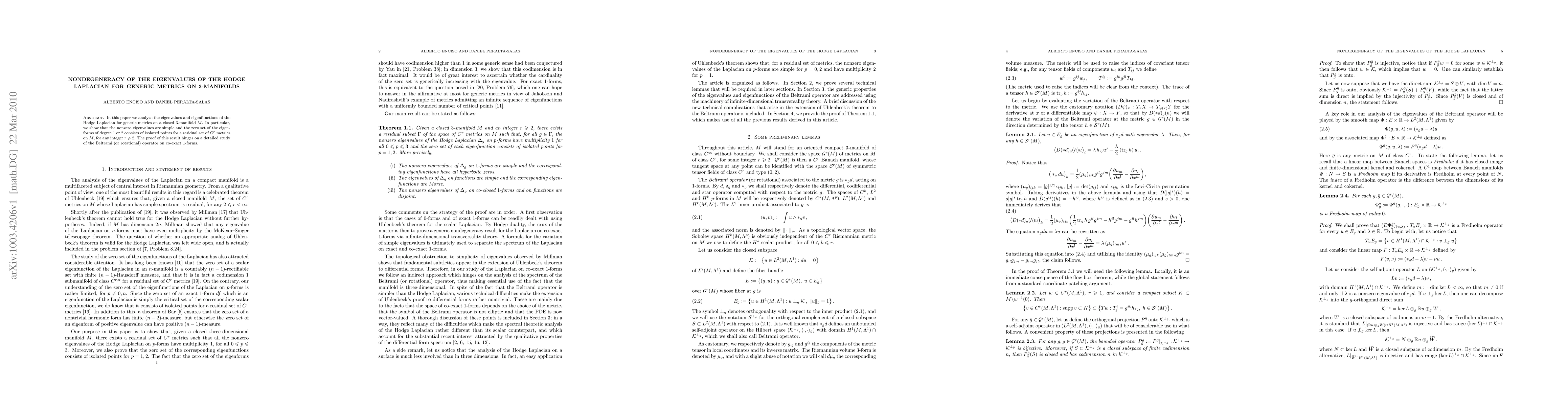Researchers prove that for most metrics on 3-manifolds, simple eigenvalues exist, while zero-forms of degree 1 or 2 have isolated points.