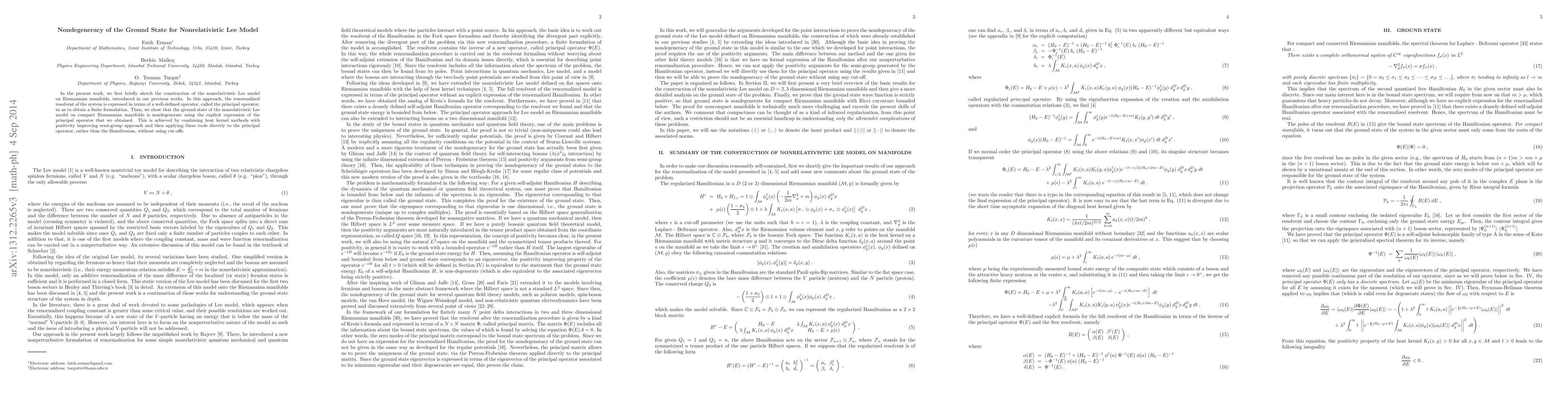 This paper establishes the nondegeneracy of the ground state for the nonrelativistic Lee model on compact Riemannian manifolds by constructing a finite formulation using a principal operator. It achieves this through heat kernel methods and a positivity improving semi-group approach, directly applied to the principal operator.