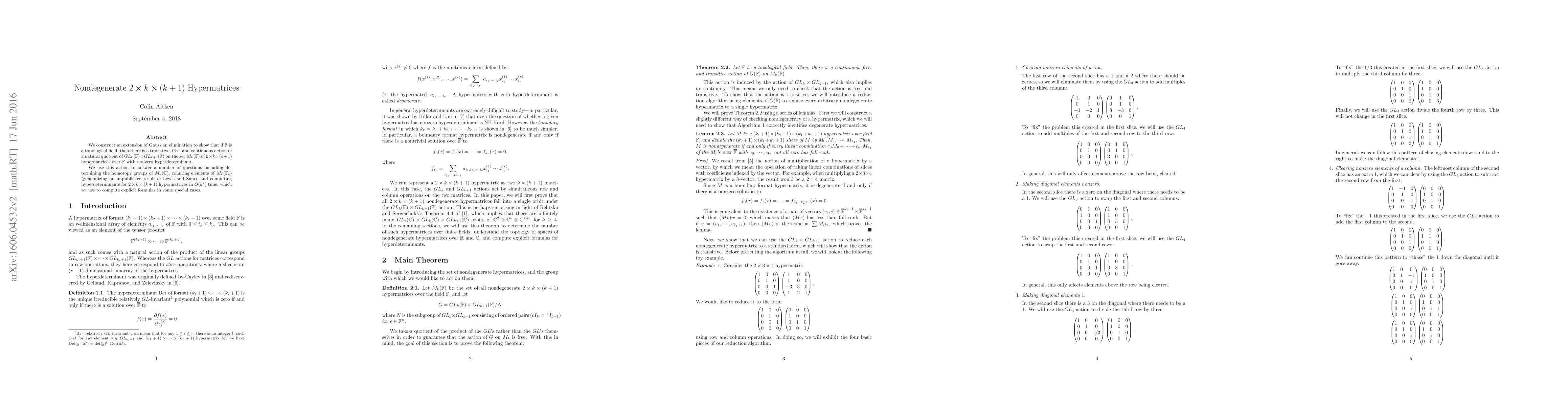 We construct an extension of Gaussian elimination to show that if $\mathbb{F}$ is a topological field, then there is a transitive, free, and continuous action of a natural quotient of $GL_k(\mathbb{F}) \times GL_{k+1}(\mathbb{F})$ on the set $M_k(\mathbb{F})$ of $2 \times k \times (k+1)$ hypermatrices over $\mathbb{F}$ with nonzero hyperdeterminant. We use this action to answer a number of questions including determining the homotopy groups of $M_k(\mathbb{C})$, counting elements of $M_k(\mathbb{F}_q)$ (generalizing an unpublished result of Lewis and Sam), and computing hyperdeterminants for $2 \times k \times (k+1)$ hypermatrices in $O(k^4)$ time, which we use to compute explicit formulas in some special cases.