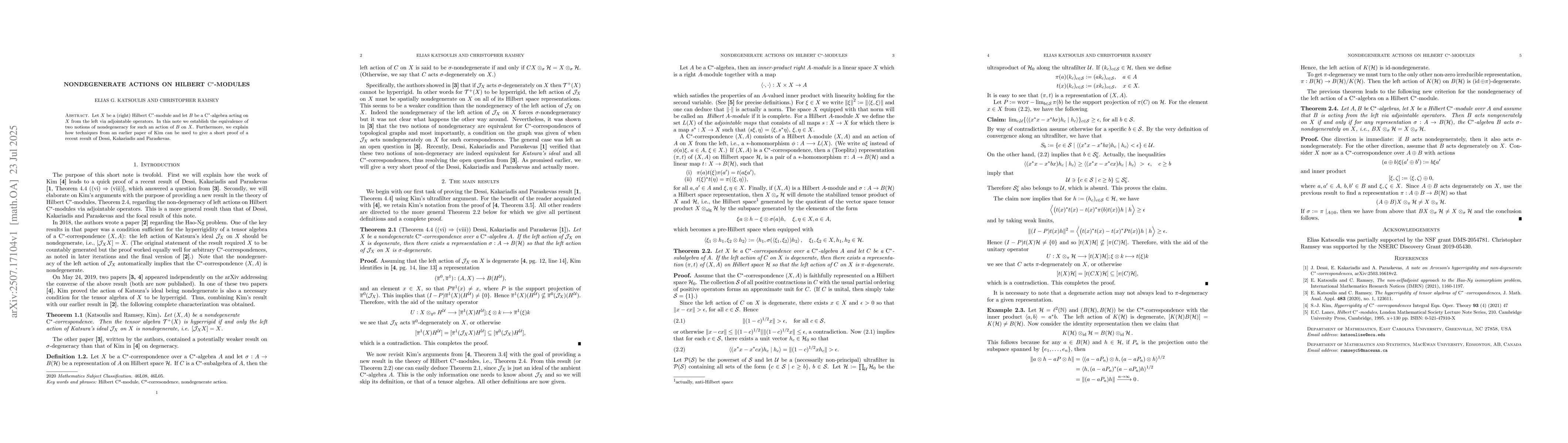 The paper establishes the equivalence of two notions of nondegeneracy for left actions of C*-algebras on Hilbert C*-modules, utilizing techniques from an earlier paper by Kim.