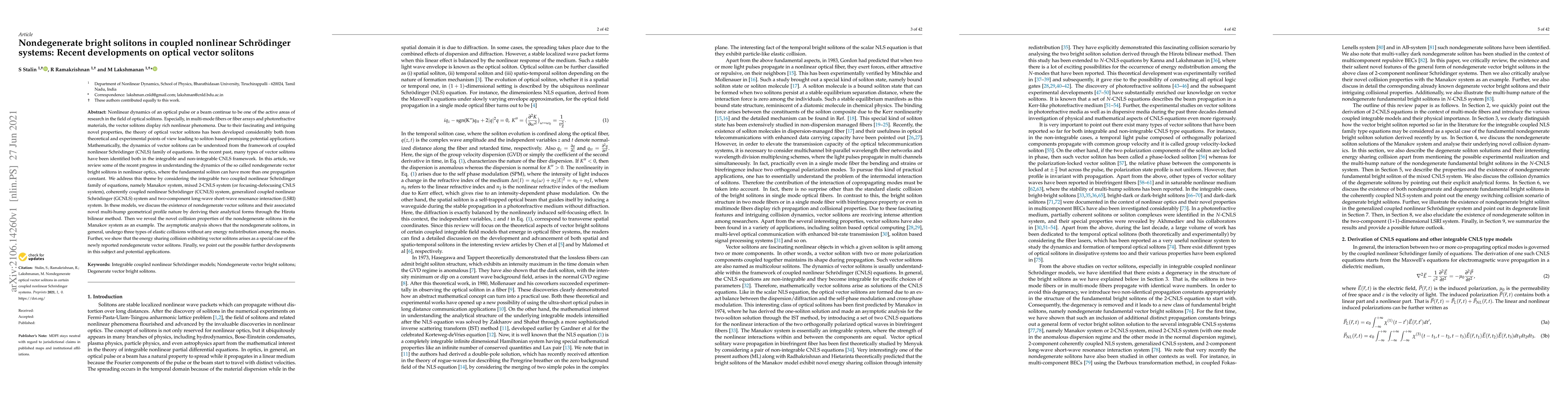 Nonlinear dynamics of an optical pulse or a beam continue to be one of the active areas of research in the field of optical solitons. Especially, in multi-mode fibers or fiber arrays and photorefractive materials, the vector solitons display rich nonlinear phenomena. Due to their fascinating and intriguing novel properties, the theory of optical vector solitons has been developed considerably both from theoretical and experimental points of view leading to soliton based promising potential applications. In the recent past, many types of vector solitons have been identified both in the integrable and non-integrable coupled nonlinear Schr\"{o}dinger (CNLS) equations framework. In this article, we review some of the recent progress in understanding the dynamics of the so called nondegenerate vector bright solitons in nonlinear optics, where the fundamental soliton can have more than one propagation constant. We address this theme by considering the integrable two CNLS family of equations, namely Manakov system, mixed 2-CNLS system, coherently CNLS system, generalized CNLS system and two-component long-wave short-wave resonance interaction (LSRI) system. In these models, we discuss the existence of nondegenerate vector solitons and their associated novel multi-hump geometrical profile nature by deriving their analytical forms through the Hirota bilinear method. Then we reveal the novel collision properties of the nondegenerate solitons in the Manakov system as an example. The asymptotic analysis shows that the nondegenerate solitons, in general, undergo three types of elastic collisions without any energy redistribution among the modes. Further, we show that the energy sharing collision exhibiting vector solitons arises as a special case of the newly reported nondegenerate vector solitons. Finally, we point out the possible further developments in this subject and potential applications.