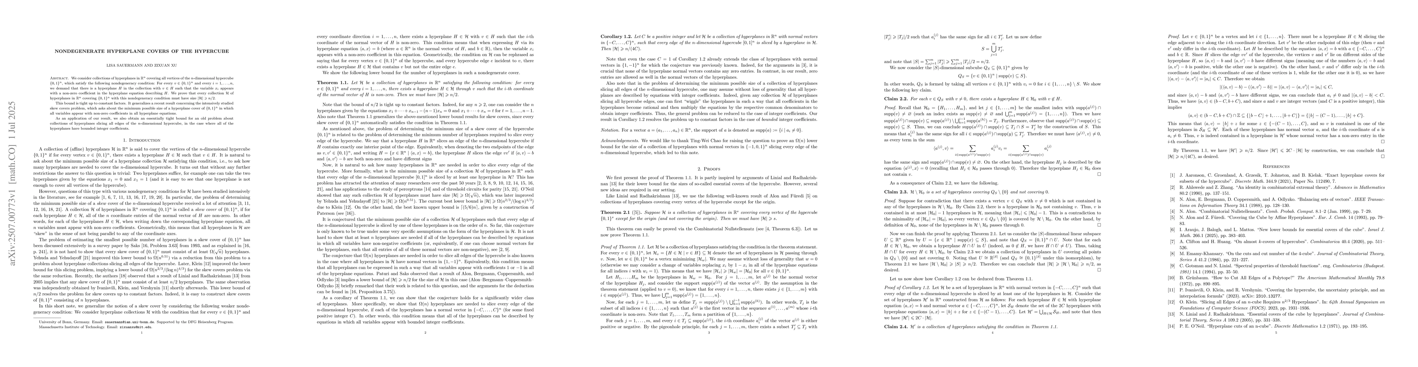 We consider collections of hyperplanes in $\mathbb{R}^n$ covering all vertices of the $n$-dimensional hypercube $\{0,1\}^n$, which satisfy the following nondegeneracy condition: For every $v\in \{0,1\}^n$ and every $i=1,\dots,n$, we demand that there is a hyperplane $H$ in the collection with $v\in H$ such that the variable $x_i$ appears with a non-zero coefficient in the hyperplane equation describing $H$. We prove that every collection $\mathcal{H}$ of hyperplanes in $\mathbb{R}^n$ covering $\{0,1\}^n$ with this nondegeneracy condition must have size $|\mathcal{H}|\ge n/2$. This bound is tight up to constant factors. It generalizes a recent result concerning the intensively studied skew covers problem, which asks about the minimum possible size of a hyperplane cover of $\{0,1\}^n$ in which all variables appear with non-zero coefficients in all hyperplane equations. As an application of our result, we also obtain an essentially tight bound for an old problem about collections of hyperplanes slicing all edges of the $n$-dimensional hypercube, in the case where all of the hyperplanes have bounded integer coefficients.