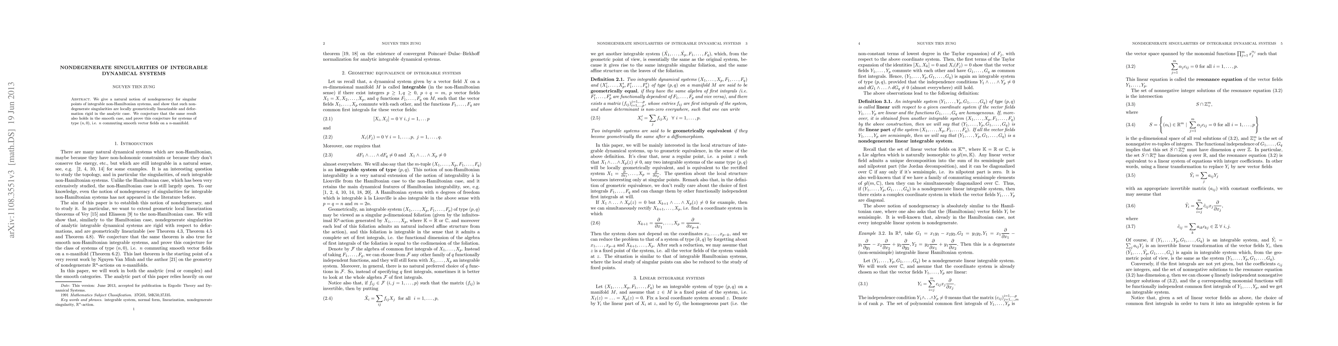This paper introduces a concept of nondegeneracy for singular points in integrable non-Hamiltonian systems, demonstrating their local geometric linearity and deformation rigidity in the analytic case. The authors conjecture and partially prove the same result for smooth systems, specifically for systems of type $(n,0)$ with $n$ commuting smooth vector fields.