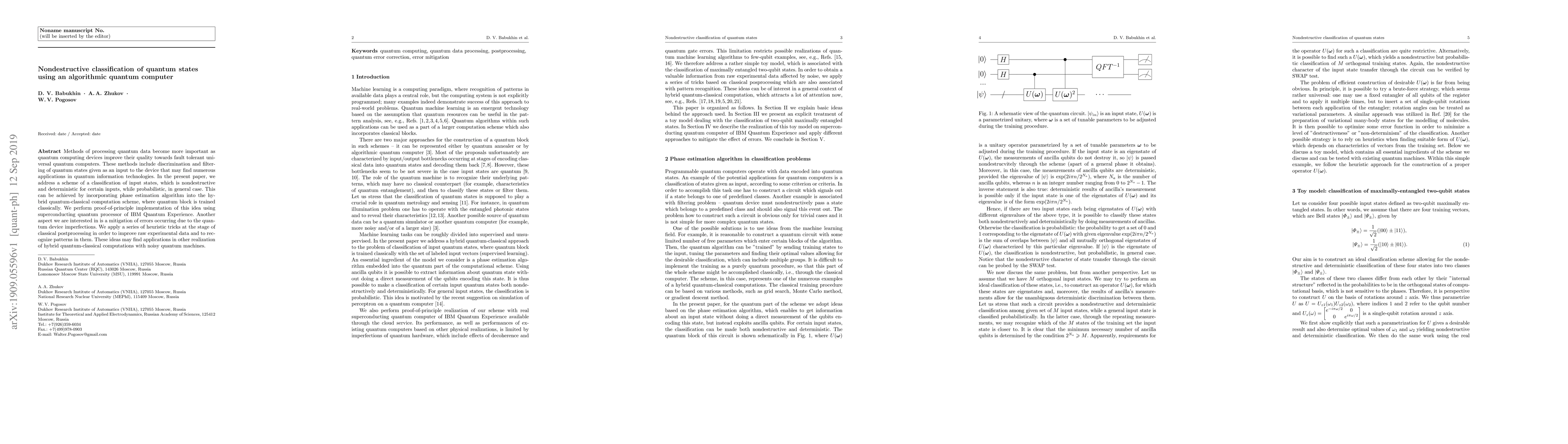 Methods of processing quantum data become more important as quantum computing devices improve their quality towards fault tolerant universal quantum computers. These methods include discrimination and filtering of quantum states given as an input to the device that may find numerous applications in quantum information technologies. In the present paper, we address a scheme of a classification of input states, which is nondestructive and deterministic for certain inputs, while probabilistic, in general case. This can be achieved by incorporating phase estimation algorithm into the hybrid quantum-classical computation scheme, where quantum block is trained classically. We perform proof-of-principle implementation of this idea using superconducting quantum processor of IBM Quantum Experience. Another aspect we are interested in is a mitigation of errors occurring due to the quantum device imperfections. We apply a series of heuristic tricks at the stage of classical postprocessing in order to improve raw experimental data and to recognize patterns in them. These ideas may find applications in other realization of hybrid quantum-classical computations with noisy quantum machines.