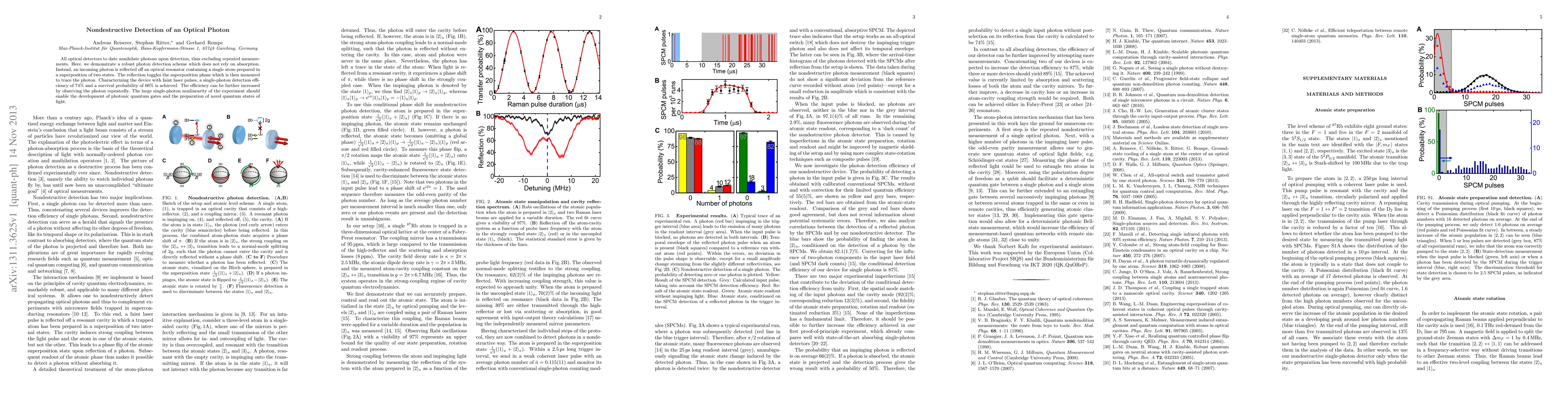 This paper presents a nondestructive optical photon detector that reflects photons without absorbing them, enabling repeated measurements. The method uses an optical resonator with a single atom in a superposition state, achieving 74% detection efficiency and 66% photon survival. This approach could advance photonic quantum gates and quantum state preparation.