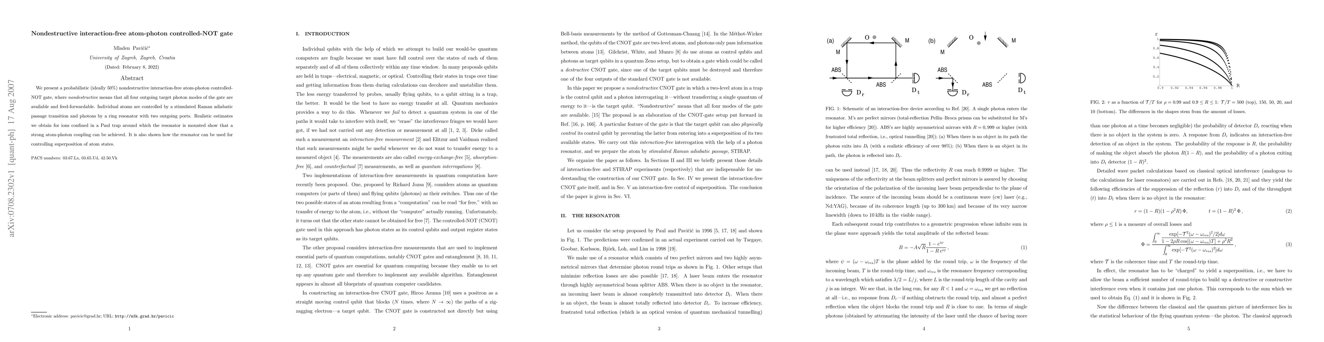 We present a probabilistic (ideally 50%) nondestructive interaction-free atom-photon controlled-NOT gate, where nondestructive means that all four outgoing target photon modes of the gate are available and feed-forwardable. Individual atoms are controlled by a stimulated Raman adiabatic passage transition and photons by a ring resonator with two outgoing ports. Realistic estimates we obtain for ions confined in a Paul trap around which the resonator is mounted show that a strong atom-photon coupling can be achieved. It is also shown how the resonator can be used for controlling superposition of atom states.
