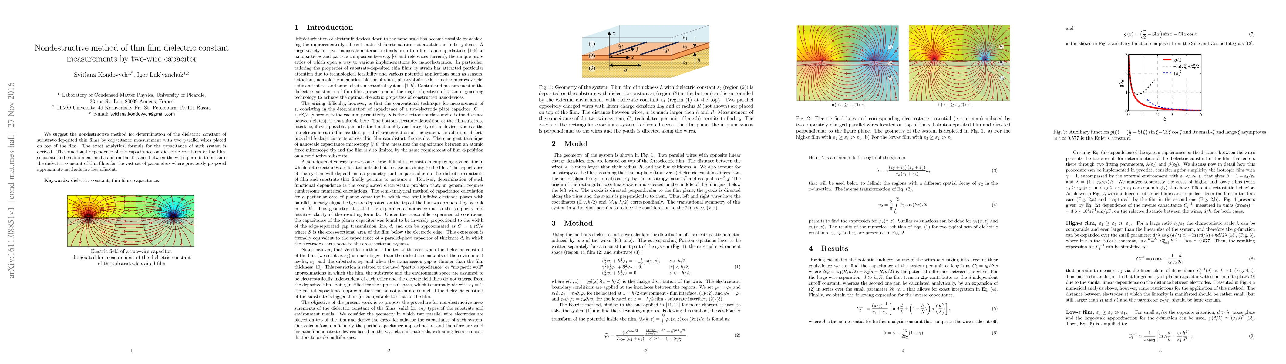 This paper proposes a nondestructive method for measuring the dielectric constant of thin films using a two-wire capacitor setup. An exact analytical formula for the capacitance is derived, enabling accurate measurements across a wide range of parameters where traditional methods are ineffective.