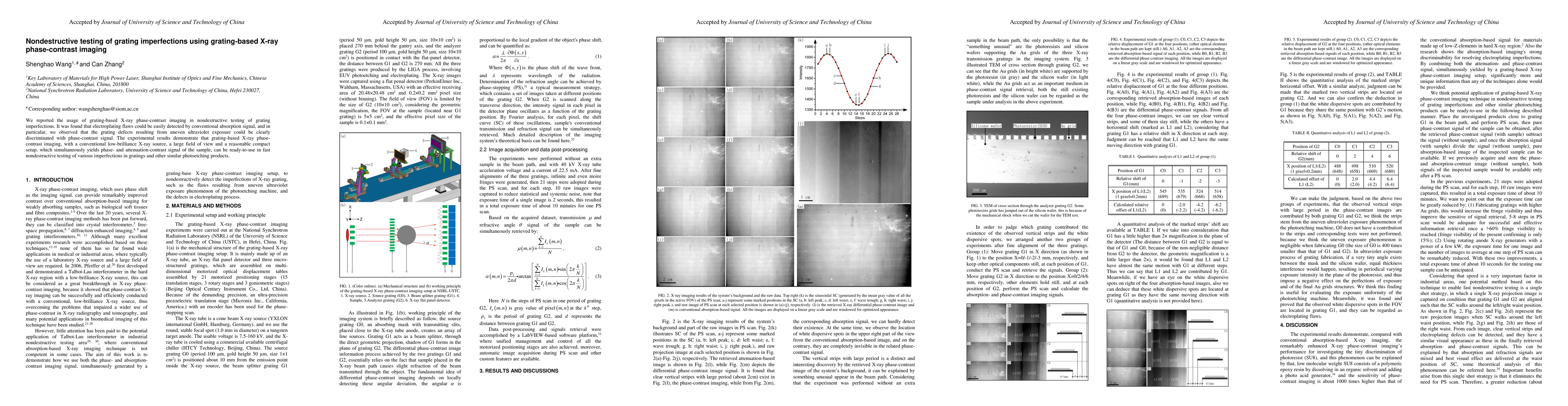 This paper demonstrates the effectiveness of grating-based X-ray phase-contrast imaging for nondestructive testing of grating imperfections, showing that it can detect electroplating flaws and uneven ultraviolet exposure defects more clearly than conventional absorption imaging. The method is practical with a low-brilliance X-ray source and provides both phase- and attenuation-contrast signals.