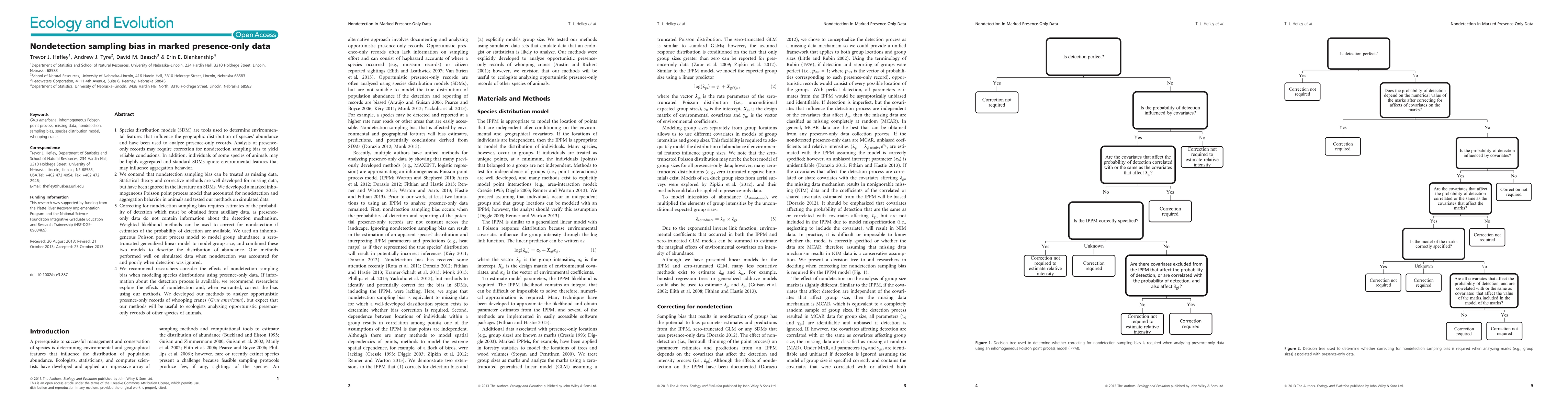 This paper discusses the importance of correcting nondetection sampling bias in species distribution models (SDMs) using presence-only data, proposing a marked inhomogeneous Poisson point process model to account for this bias and aggregation behavior. The authors recommend using weighted likelihood methods to correct for nondetection when detection probability estimates are available, demonstrating the effectiveness of their approach on simulated data.