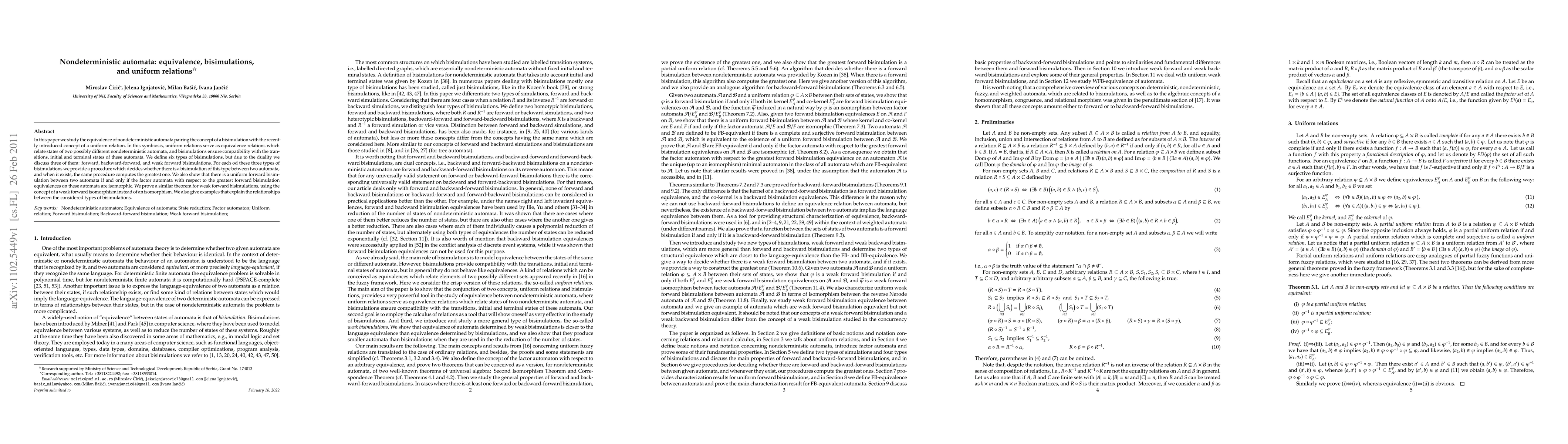 This paper explores the equivalence of nondeterministic automata through bisimulations and uniform relations, defining three types of bisimulations and providing procedures to determine their existence and compute the greatest ones. It also establishes isomorphism conditions for factor automata under these bisimulations.