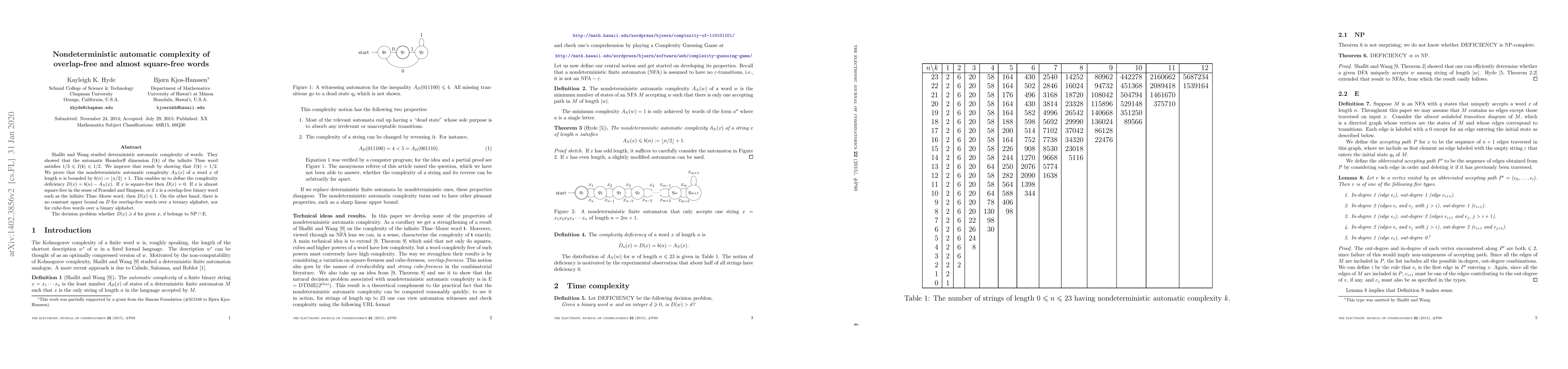 Shallit and Wang studied deterministic automatic complexity of words. They showed that the automatic Hausdorff dimension $I(\mathbf t)$ of the infinite Thue word satisfies $1/3\le I(\mathbf t)\le 2/3$. We improve that result by showing that $I(\mathbf t)\ge 1/2$. For nondeterministic automatic complexity we show $I(\mathbf t)=1/2$. We prove that such complexity $A_N$ of a word $x$ of length $n$ satisfies $A_N(x)\le b(n):=\lfloor n/2\rfloor + 1$. This enables us to define the complexity deficiency $D(x)=b(n)-A_N(x)$. If $x$ is square-free then $D(x)=0$. If $x$ almost square-free in the sense of Fraenkel and Simpson, or if $x$ is a strongly cube-free binary word such as the infinite Thue word, then $D(x)\le 1$. On the other hand, there is no constant upper bound on $D$ for strongly cube-free words in a ternary alphabet, nor for cube-free words in a binary alphabet. The decision problem whether $D(x)\ge d$ for given $x$, $d$ belongs to $NP\cap E$.