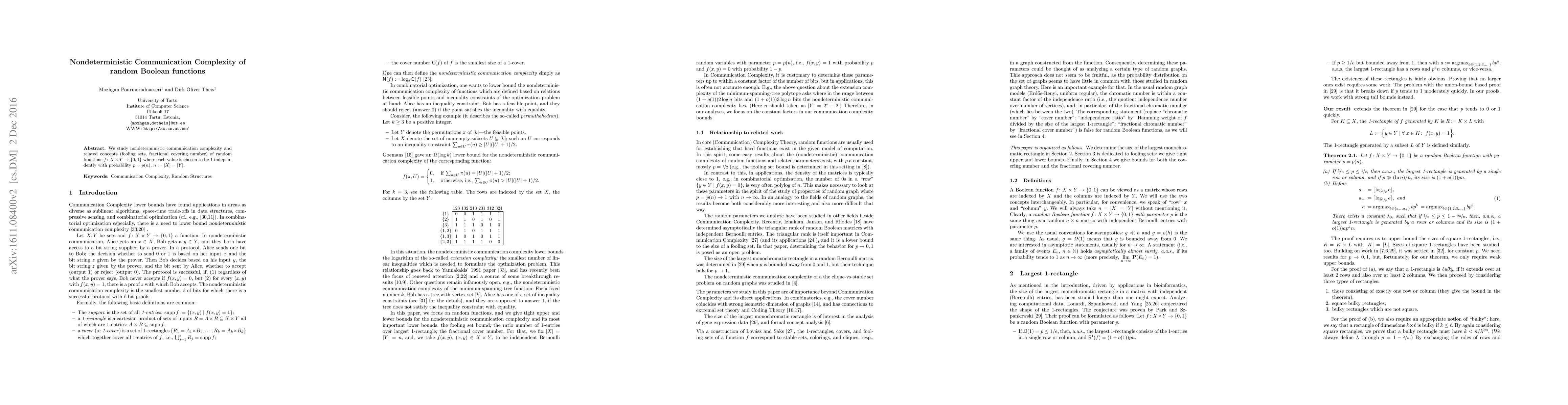 This paper investigates the nondeterministic communication complexity and related measures (fooling sets, fractional covering number) of random Boolean functions, where each output is independently set to 1 with probability $p=p(n)$, focusing on the behavior as the input size $n$ grows.