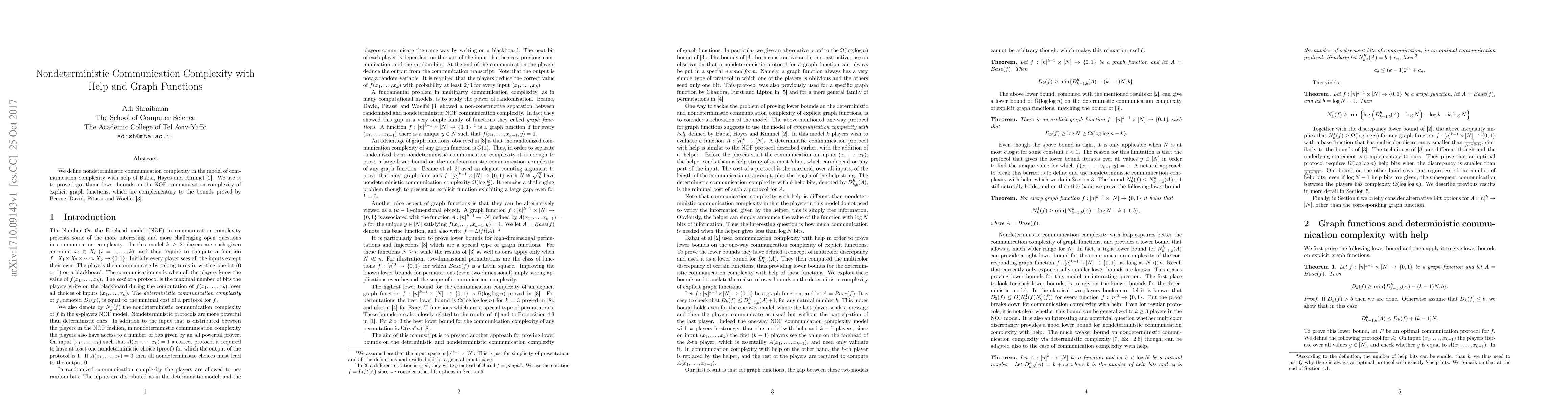 This paper introduces nondeterministic communication complexity with help and establishes logarithmic lower bounds on the NOF communication complexity for explicit graph functions, complementing previous results by Beame, David, Pitassi, and Woelfel.