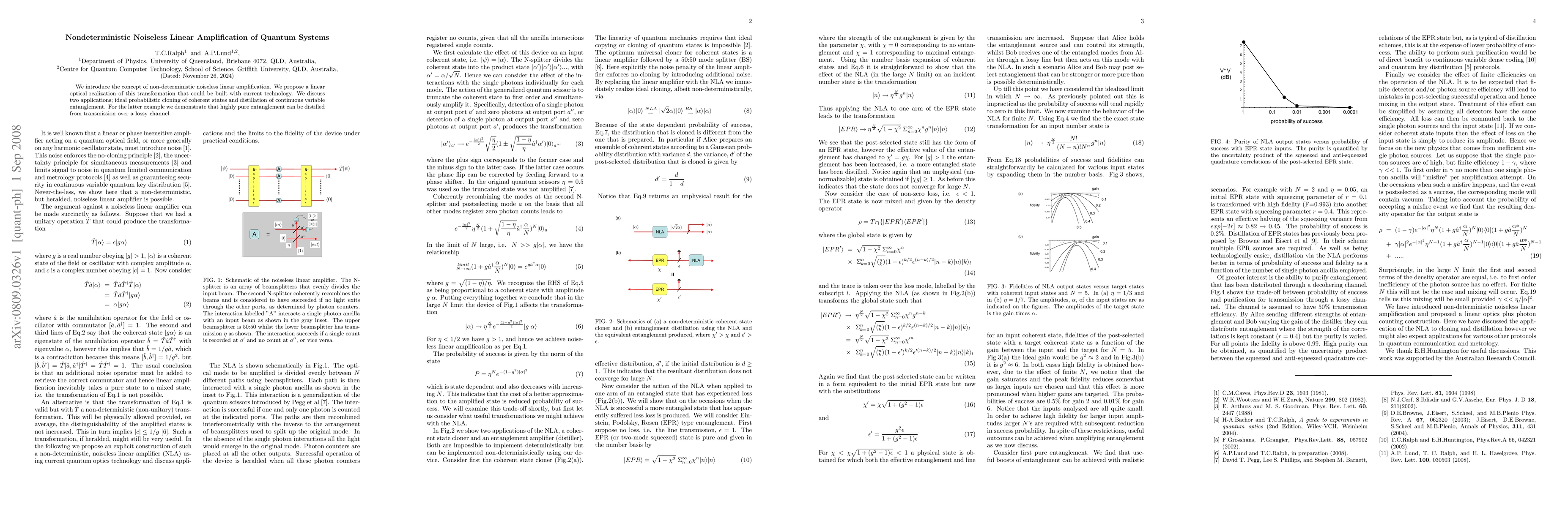This paper introduces non-deterministic noiseless linear amplification in quantum systems, proposing a linear optical implementation feasible with current technology. It explores applications in ideal probabilistic cloning of coherent states and the distillation of continuous variable entanglement, showing how pure entanglement can be extracted from lossy channels.