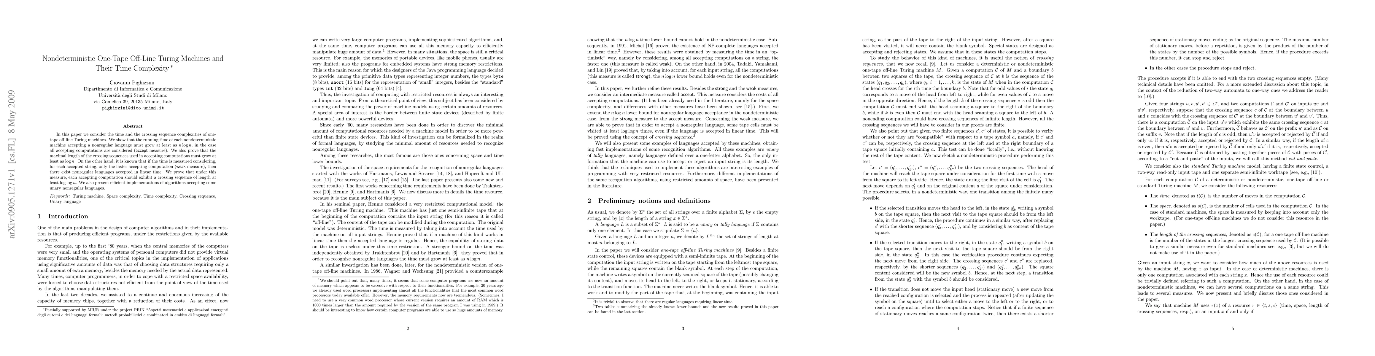 In this paper we consider the time and the crossing sequence complexities of one-tape off-line Turing machines. We show that the running time of each nondeterministic machine accepting a nonregular language must grow at least as n\log n, in the case all accepting computations are considered (accept measure). We also prove that the maximal length of the crossing sequences used in accepting computations must grow at least as \log n. On the other hand, it is known that if the time is measured considering, for each accepted string, only the faster accepting computation (weak measure), then there exist nonregular languages accepted in linear time. We prove that under this measure, each accepting computation should exhibit a crossing sequence of length at least \log\log n. We also present efficient implementations of algorithms accepting some unary nonregular languages.