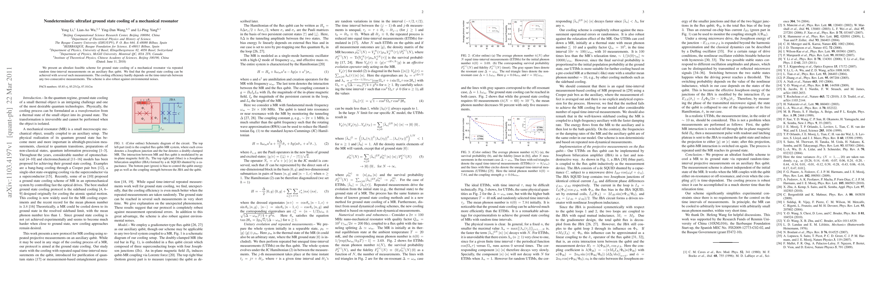 This paper proposes an ultrafast method for ground state cooling of a mechanical resonator using random time-interval measurements on an auxiliary flux qubit. The cooling efficiency remains high and is robust against environmental noise, regardless of the intervals between measurements.