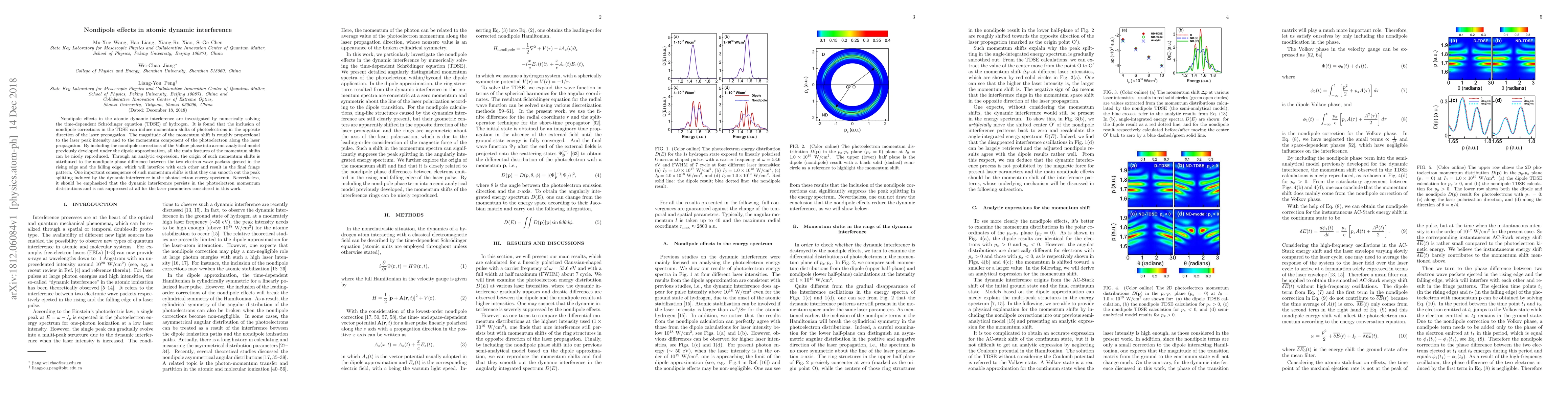 This paper investigates nondipole effects in atomic dynamic interference by numerically solving the time-dependent Schrödinger equation for hydrogen, revealing that nondipole corrections induce momentum shifts in photoelectrons opposite to laser propagation. The shifts' magnitude correlates with laser intensity and photoelectron momentum, and are explained by the nondipole phase difference between ejected electron wave packets.