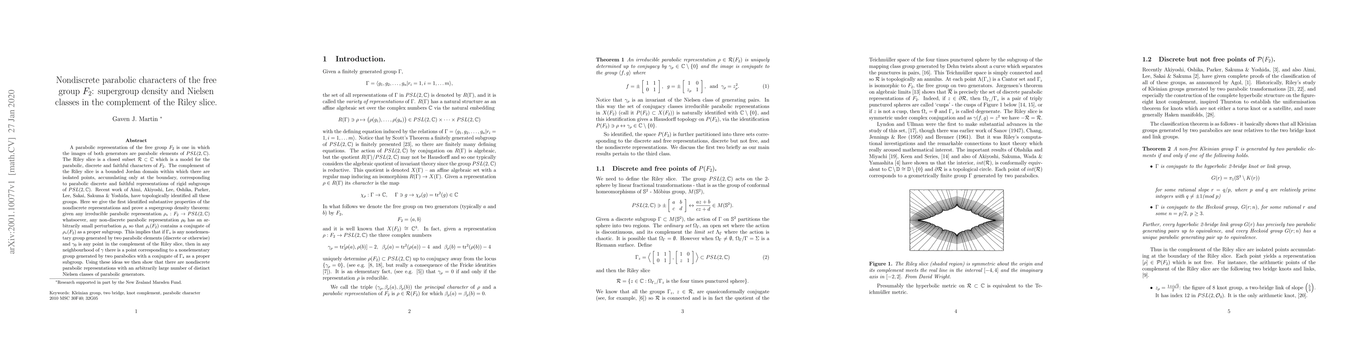 A parabolic representation of the free group $F_2$ is one in which the images of both generators are parabolic elements of $PSL(2,\IC)$. The Riley slice is a closed subset ${\cal R}\subset \IC$ which is a model for the parabolic, discrete and faithful characters of $F_2$. The complement of the Riley slice is a bounded Jordan domain within which there are isolated points, accumulating only at the boundary, corresponding to parabolic discrete and faithful representations of rigid subgroups of $PSL(2,\IC)$. Recent work of Aimi, Akiyoshi, Lee, Oshika, Parker, Lee, Sakai, Sakuma \& Yoshida, have topologically identified all these groups. Here we give the first identified substantive properties of the nondiscrete representations and prove a supergroup density theorem: given any irreducible parabolic representation $\rho_*:F_2\to PSL(2,\IC)$ whatsoever, any non-discrete parabolic representation $\rho_0$ has an arbitrarily small perturbation $\rho_\epsilon$ so that $\rho_\epsilon(F_2)$ contains a conjugate of $\rho_*(F_2)$ as a proper subgroup. This implies that if $\Gamma_*$ is any nonelementary group generated by two parabolic elements (discrete or otherwise) and $\gamma_0$ is any point in the complement of the Riley slice, then in any neighbourhood of $\gamma$ there is a point corresponding to a nonelementary group generated by two parabolics with a conjugate of $\Gamma_*$ as a proper subgroup. Using these ideas we then show that there are nondiscrete parabolic representations with an arbitrarily large number of distinct Nielsen classes of parabolic generators.