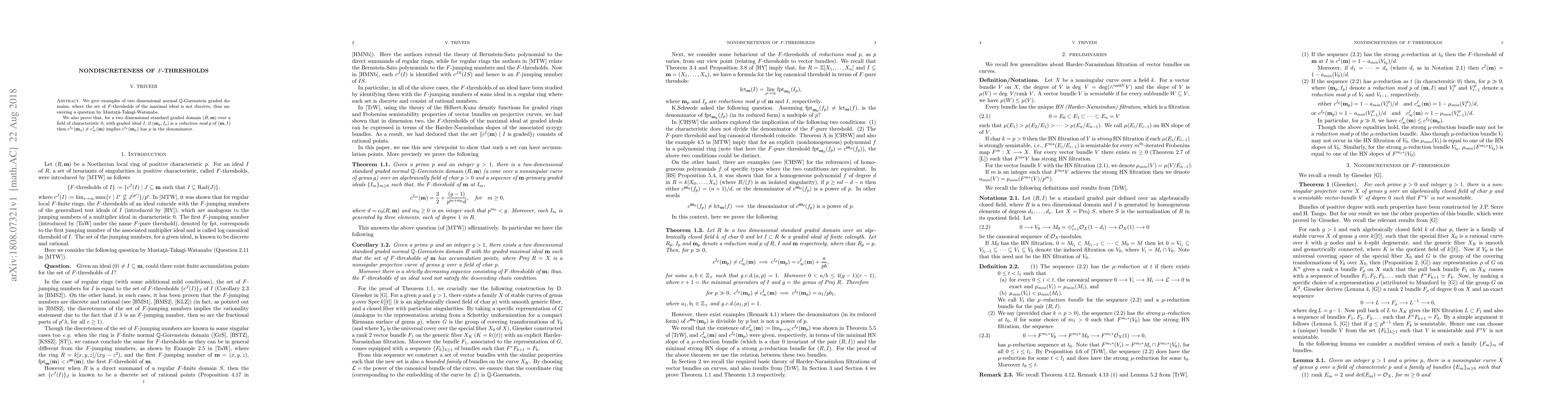 We give examples of two dimensional normal ${\mathbb Q}$-Gorenstein graded domains, where the set of $F$-thresholds of the maximal ideal is not discrete, thus answering a question by Musta\c{t}\u{a}-Takagi-Watanabe. We also prove that, for a two dimensional standard graded domain $(R, {\bf m})$ over a field of characteristic $0$, with graded ideal $I$, if $({\bf m}_p, I_p)$ is a reduction mod $p$ of $({\bf m}, I)$ then $c^{I_p}({\bf m}_p) \neq c^I_{\infty}({\bf m})$ implies $c^{I_p}({\bf m}_p)$ has $p$ in the denominator.