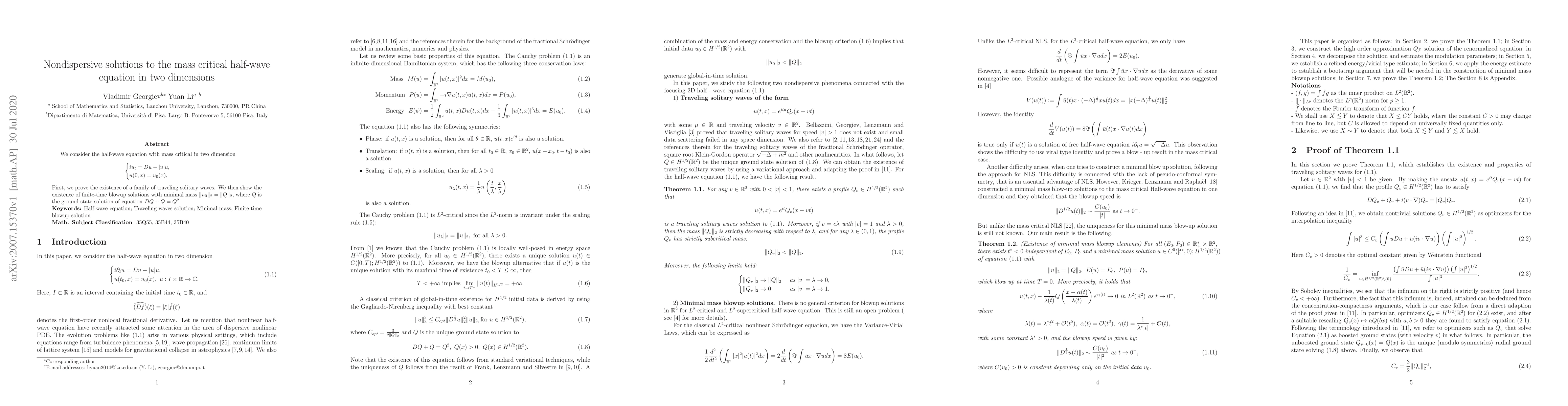 This research paper investigates solutions to a critical half-wave equation in two dimensions, finding traveling solitary waves and finite-time blowup solutions with minimal mass.