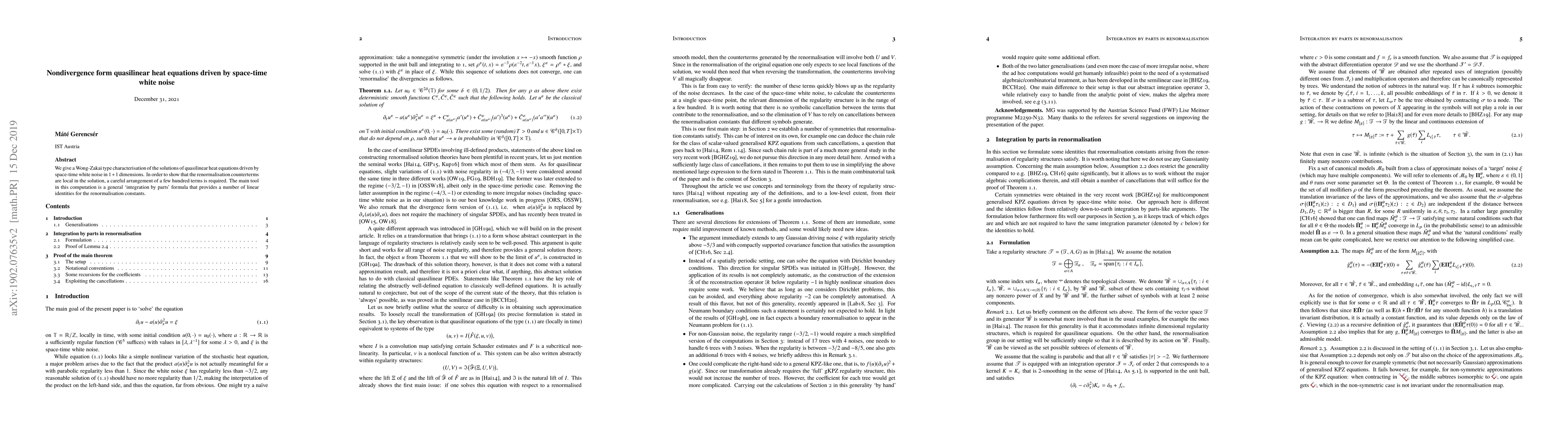 We give a Wong-Zakai type characterisation of the solutions of quasilinear heat equations driven by space-time white noise in $1+1$ dimensions. In order to show that the renormalisation counterterms are local in the solution, a careful arrangement of a few hundred terms is required. The main tool in this computation is a general integration by parts formula that provides a number of linear identities for the renormalisation constants.