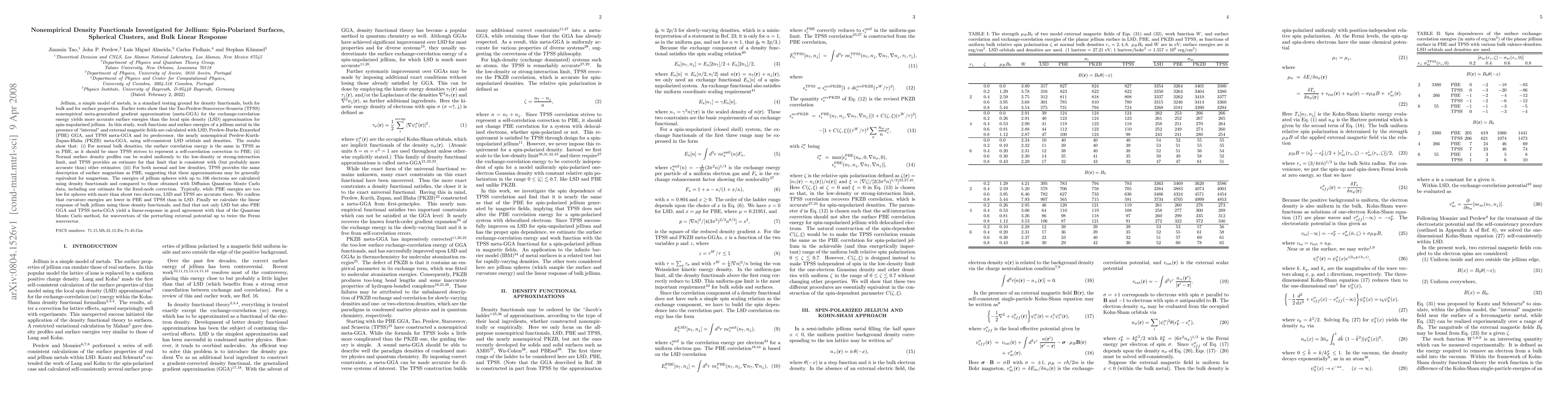 This paper investigates the performance of various nonempirical density functionals, including TPSS meta-GGA, LSD, PBE GGA, and PKZB meta-GGA, for spin-polarized jellium surfaces and spherical clusters. The results indicate that TPSS provides accurate surface energies and a consistent description of surface magnetism, while all methods show good agreement for bulk linear response.