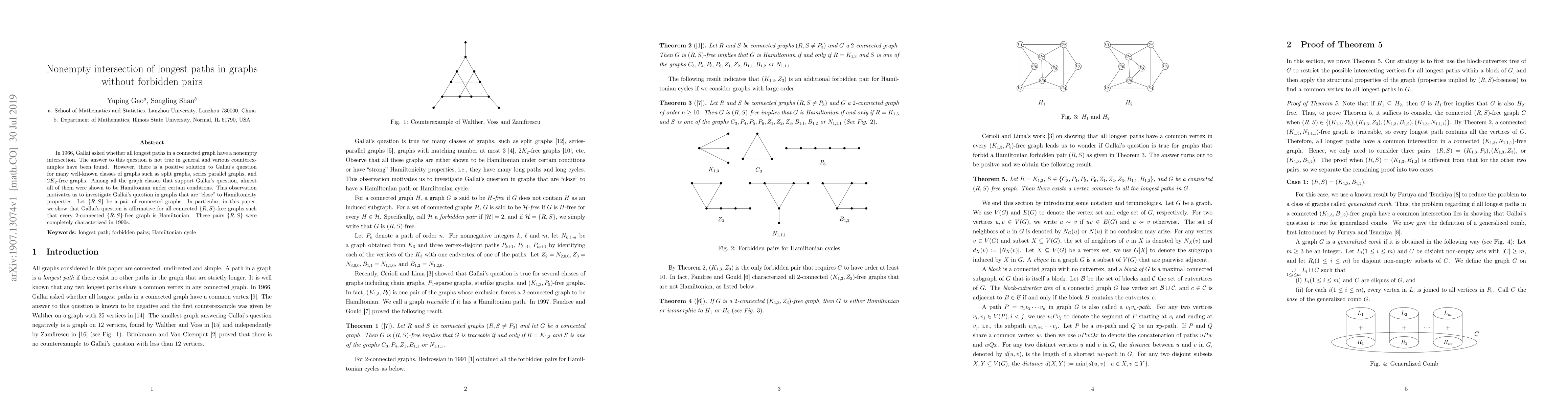 In 1966, Gallai asked whether all longest paths in a connected graph have a nonempty intersection. The answer to this question is not true in general and various counterexamples have been found. However, there is a positive solution to Gallai's question for many well-known classes of graphs such as split graphs, series parallel graphs, and $2K_2$-free graphs. Among all the graph classes that support Gallai's question, almost all of them were shown to be Hamiltonian under certain conditions. This observation motivates us to investigate Gallai's question in graphs that are "close" to Hamiltonicity properties. Let $\{R,S\}$ be a pair of connected graphs. In particular, in this paper, we show that Gallai's question is affirmative for all connected $\{R,S\}$-free graphs such that every 2-connected $\{R,S\}$-free graph is Hamiltonian. These pairs $\{R,S\}$ were completely characterized in 1990s.