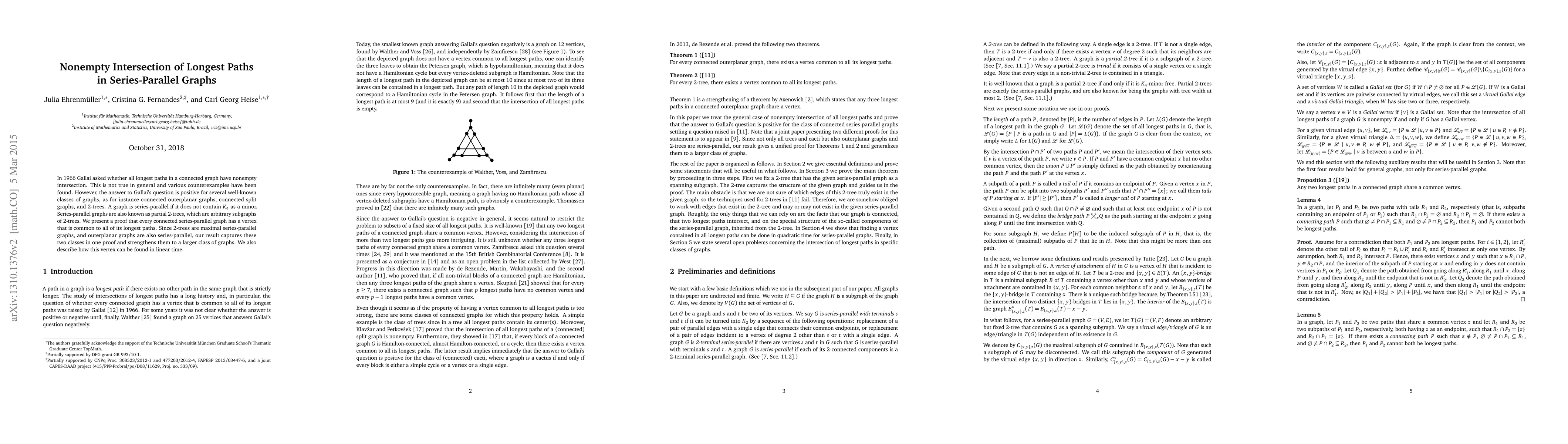 This paper proves that all longest paths in a connected series-parallel graph intersect at least at one common vertex. This result extends the findings for specific classes like outerplanar and split graphs, and provides a linear-time algorithm for finding this intersection vertex.