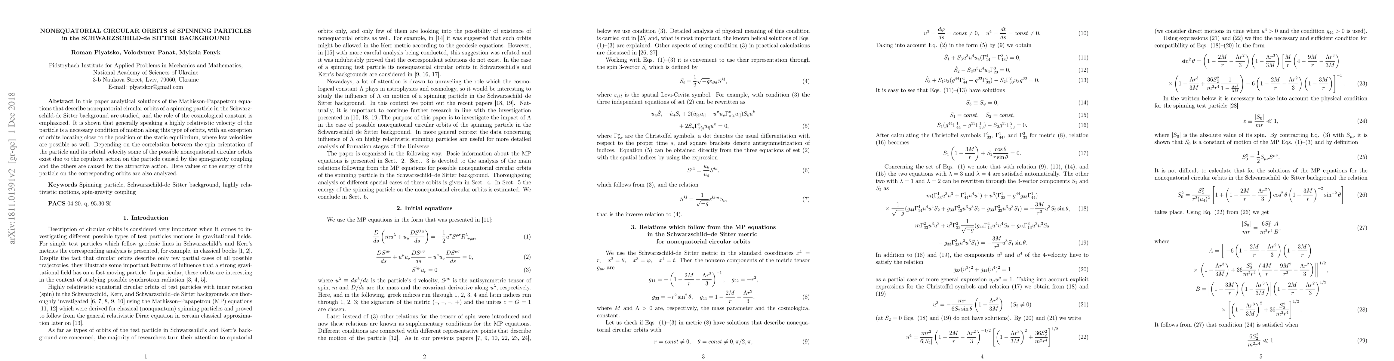 This paper investigates analytical solutions for nonequatorial circular orbits of spinning particles in the Schwarzschild-de Sitter spacetime, highlighting the influence of the cosmological constant. It finds that high relativistic velocities are typically required for such orbits, except near static equilibrium where lower velocities are possible.
