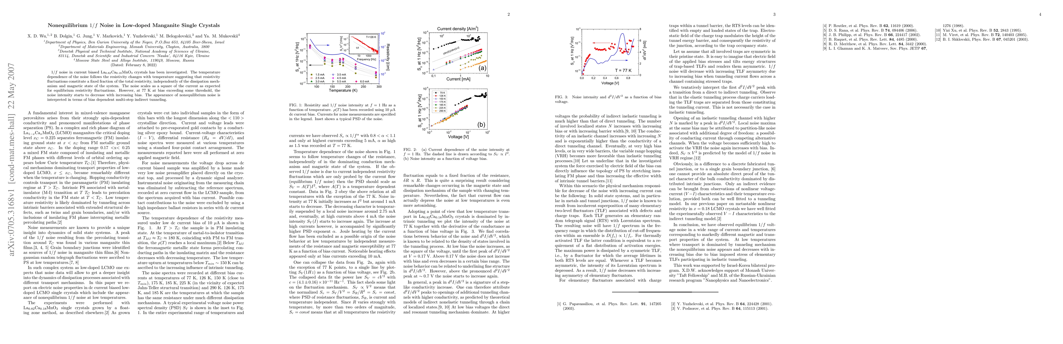 1/f noise in current biased La0.82Ca0.18MnO3 crystals has been investigated. The temperature dependence of the noise follows the resistivity changes with temperature suggesting that resistivity fluctuations constitute a fixed fraction of the total resistivity, independently of the dissipation mechanism and magnetic state of the system. The noise scales as a square of the current as expected for equilibrium resistivity fluctuations. However, at 77 K at bias exceeding some threshold, the noise intensity starts to decrease with increasing bias. The appearance of nonequilibrium noise is interpreted in terms of bias dependent multi-step indirect tunneling.
