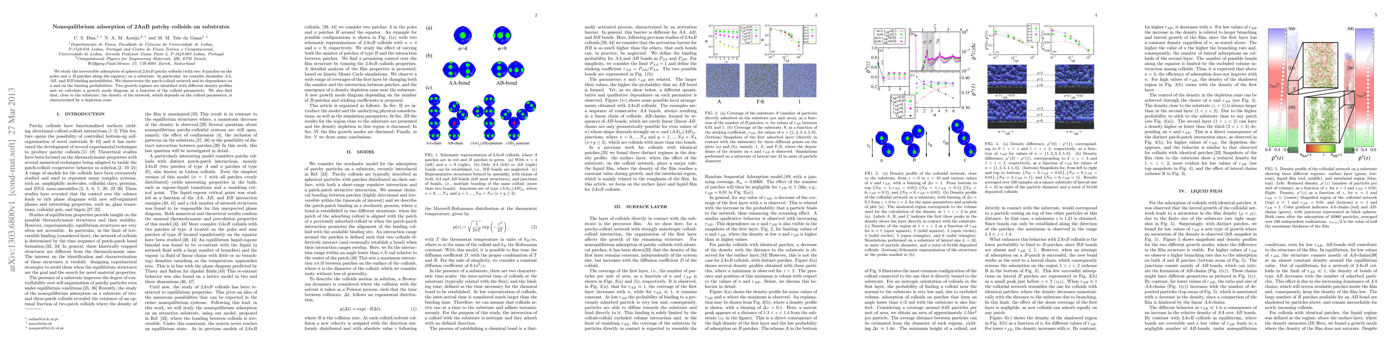 We study the irreversible adsorption of spherical $2AnB$ patchy colloids (with two $A$-patches on the poles and $n$ $B$-patches along the equator) on a substrate. In particular, we consider dissimilar $AA$, $AB$, and $BB$ binding probabilities. We characterize the patch-colloid network and its dependence on $n$ and on the binding probabilities. Two growth regimes are identified with different density profiles and we calculate a growth mode diagram as a function of the colloid parameters. We also find that, close to the substrate, the density of the network, which depends on the colloid parameters, is characterized by a depletion zone.