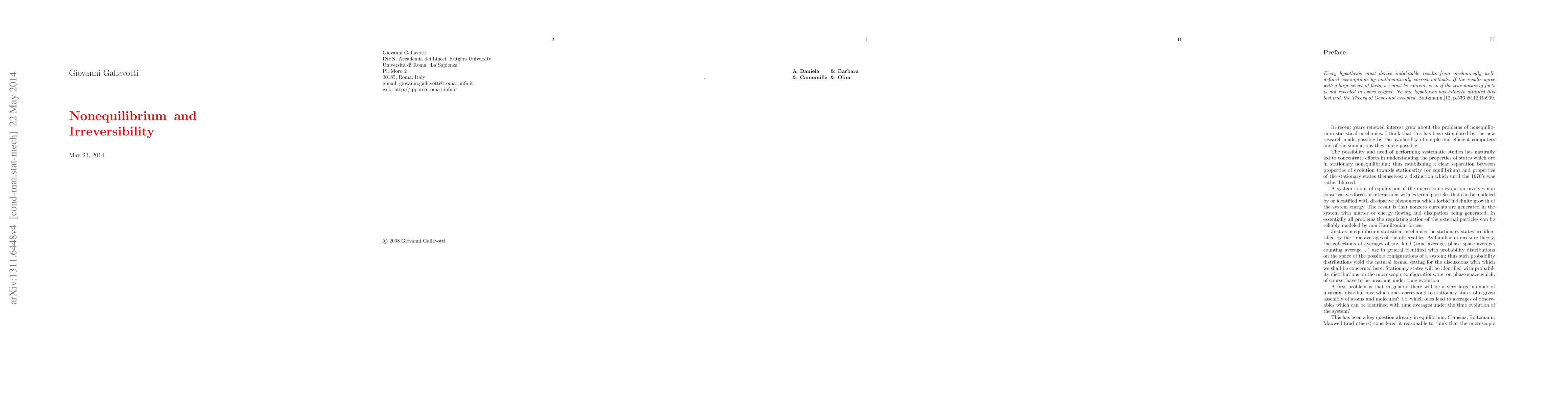 The booklet contain an overview on selected recent developments in nonequilibrium statistical mechanics and chaos theory: SRB distributions, chaotic hypothesis, fluctuation theorem, proposals for tests and applications to granular materials, fluidodynamics, irreversibility of quasi static processes. In appendices examples of the kind of technical work necessary for actual construction of nonequilibrium stationary states.