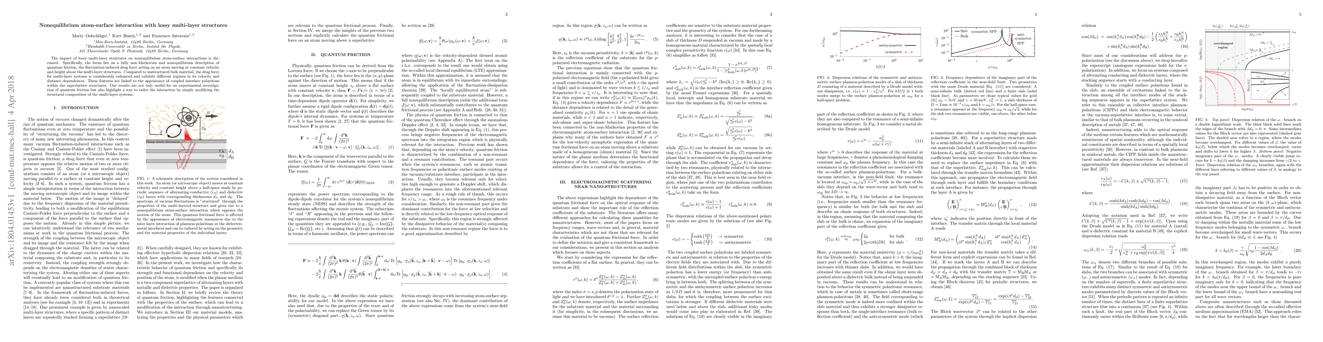 The impact of lossy multi-layer structures on nonequilibrium atom-surface interactions is discussed. Specifically, the focus lies on a fully non-Markovian and nonequilibrium description of quantum friction, the fluctuation-induced drag force acting on an atom moving at constant velocity and height above the multi-layer structures. Compared to unstructured bulk material, the drag force for multi-layer systems is considerably enhanced and exhibits different regimes in its velocity and distance dependences. These features are linked to the appearance of coupled interface polaritons within the superlattice structures. Our results are not only useful for an experimental investigation of quantum friction but also highlight a way to tailor the interaction by simply modifying the structural composition of the multi-layer systems.