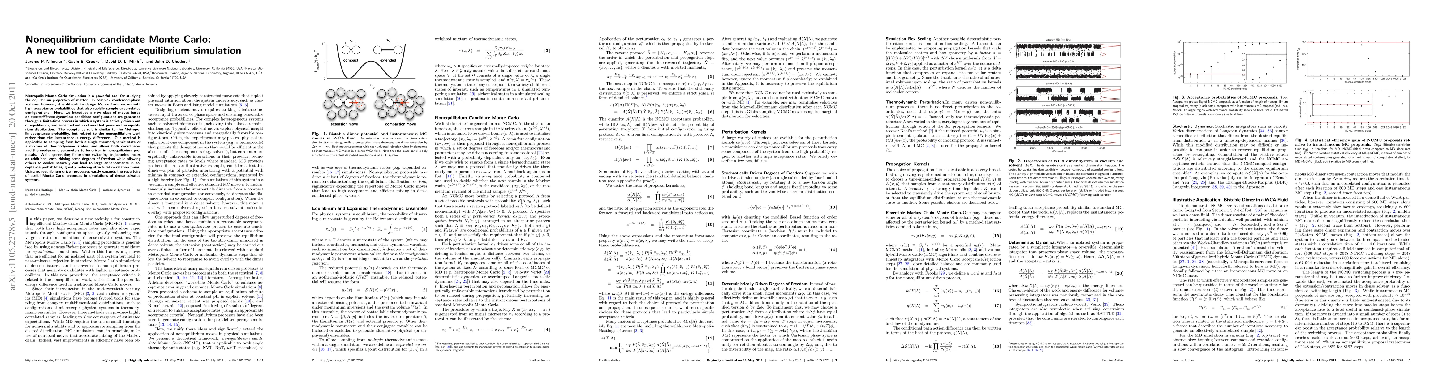 This paper introduces a new Monte Carlo simulation method based on nonequilibrium dynamics to enhance the efficiency of equilibrium simulations. By actively driving systems out of equilibrium and accepting configurations based on nonequilibrium work, the method significantly improves acceptance probabilities and reduces structural correlation times in complex condensed-phase systems.